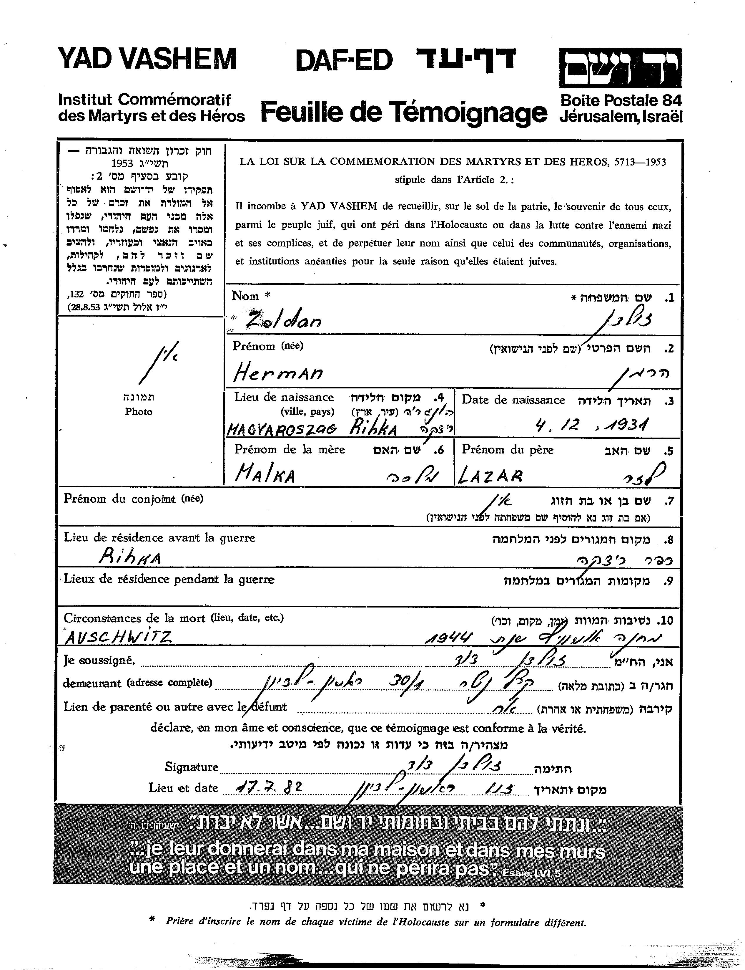 Zoldan Herman 1931 Ricka, Tchécoslovaquie Feuille de témoignage