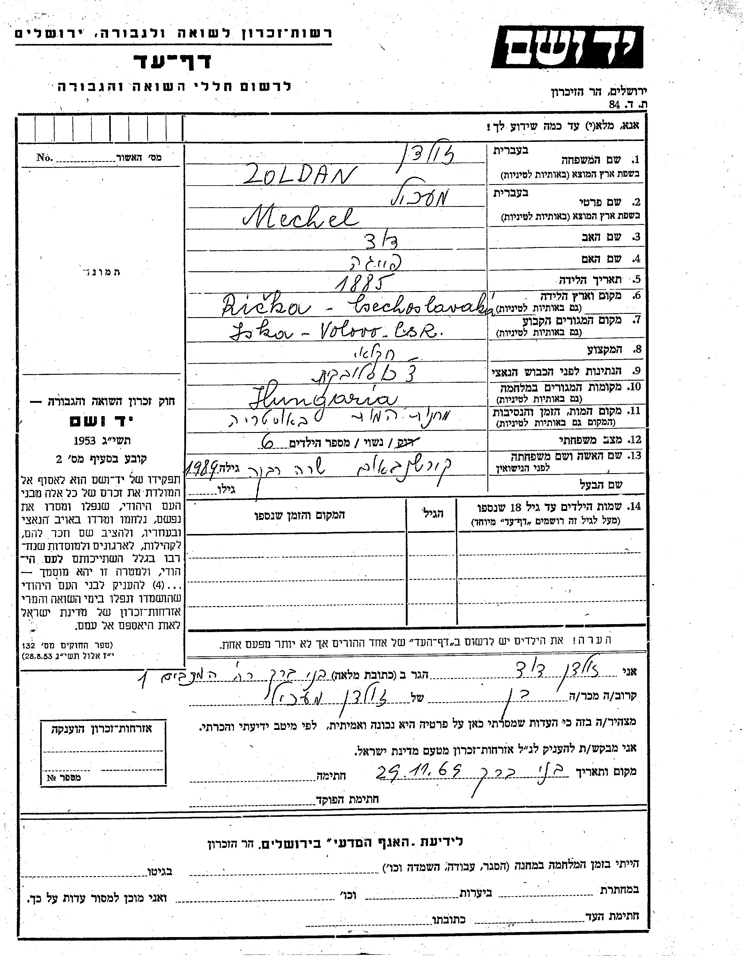 Mechel Zoldan est né à Ricka, Tchécoslovaquie en 1885, fils de David et de Feiga. Il était Agriculteur et Mariée à Sara Rivka née Kirshenbaum. Avant la seconde guerre mondiale il vivait à Iska, Tchécoslovaquie. Au cours de la guerre, il était à Hongrie.