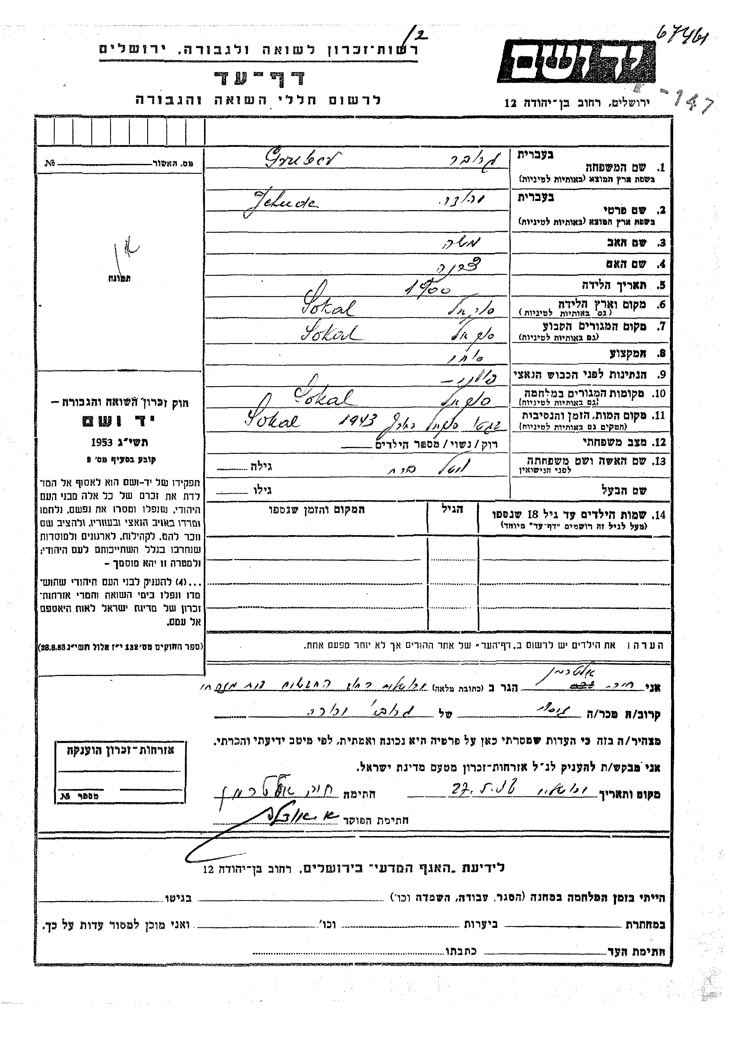 Yehude Gruber est né à Sokal, Pologne en 1900, fils de Moshe et de Charna. Il était Commerçant/e. Avant la seconde guerre mondiale il vivait à Sokal, Pologne. Au cours de la guerre, il était à Sokal, Pologne.