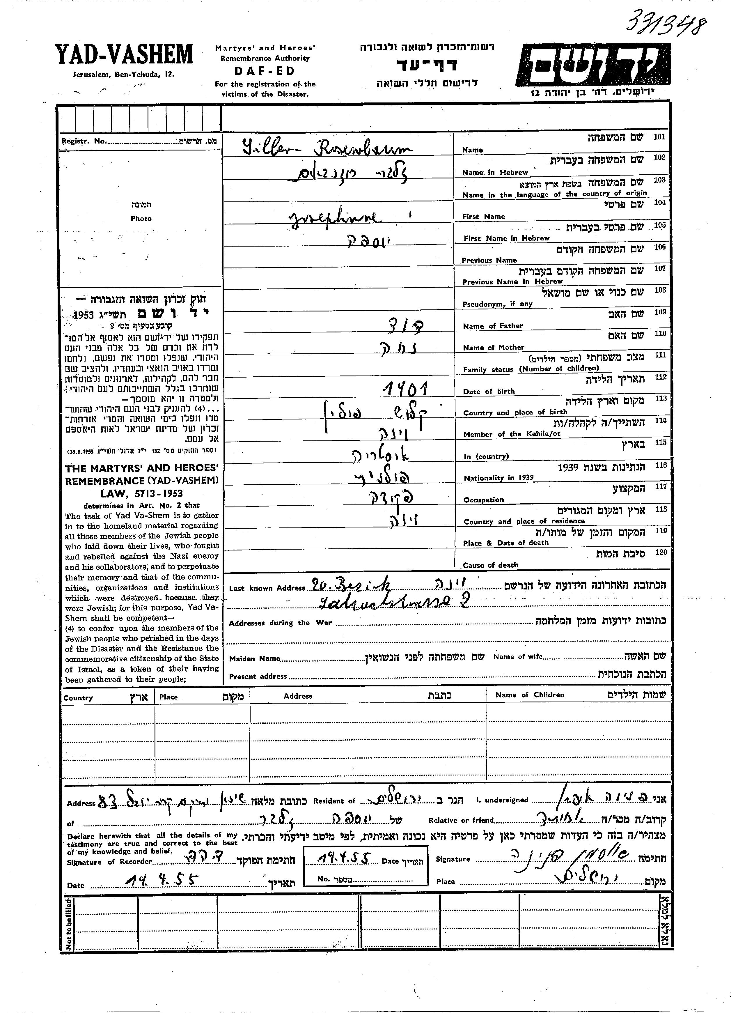 Yad Vashem - Pages of Testimony Names Memorial Collection