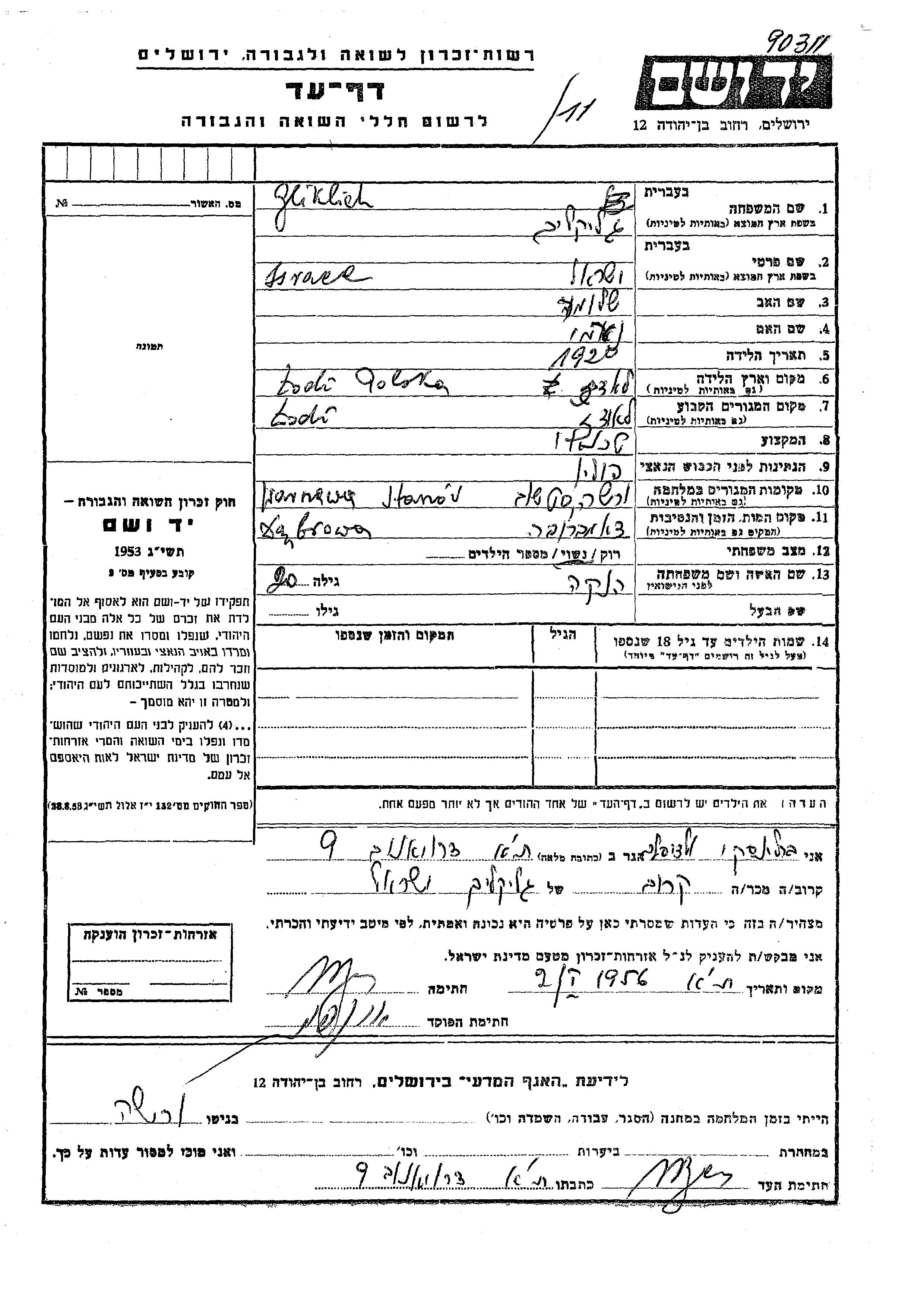 Gliklich Israel 1920 Lodz, Pologne Feuille de témoignage