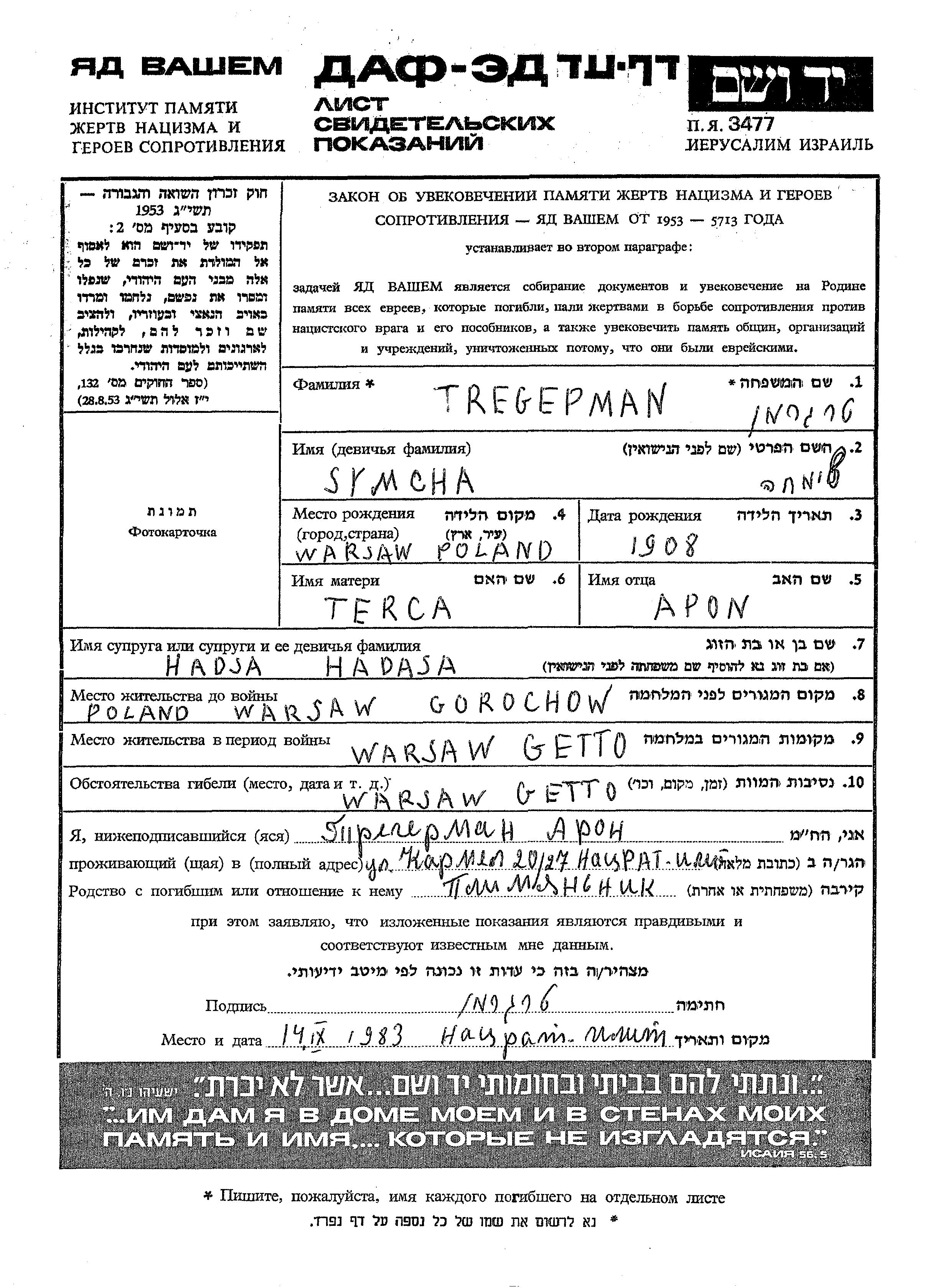 Tregerman Symcha 1908 Warsaw, Pologne Feuille de témoignage