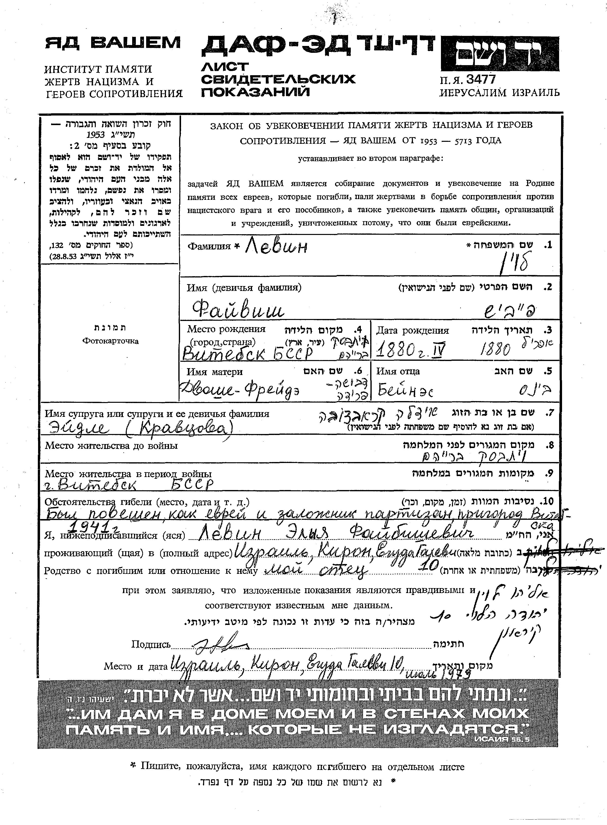 Faivish Levin est né à Vitebsk, Bélorussie (URSS) en 1880, fils de Bines et de Dvosha Frida. Il était Mariée à Eidle Eidle née Kravtzov. Avant la seconde guerre mondiale il vivait à Vitebsk, Bélorussie (URSS). Au cours de la guerre, il était à Vitebsk, Bélorussie (URSS).