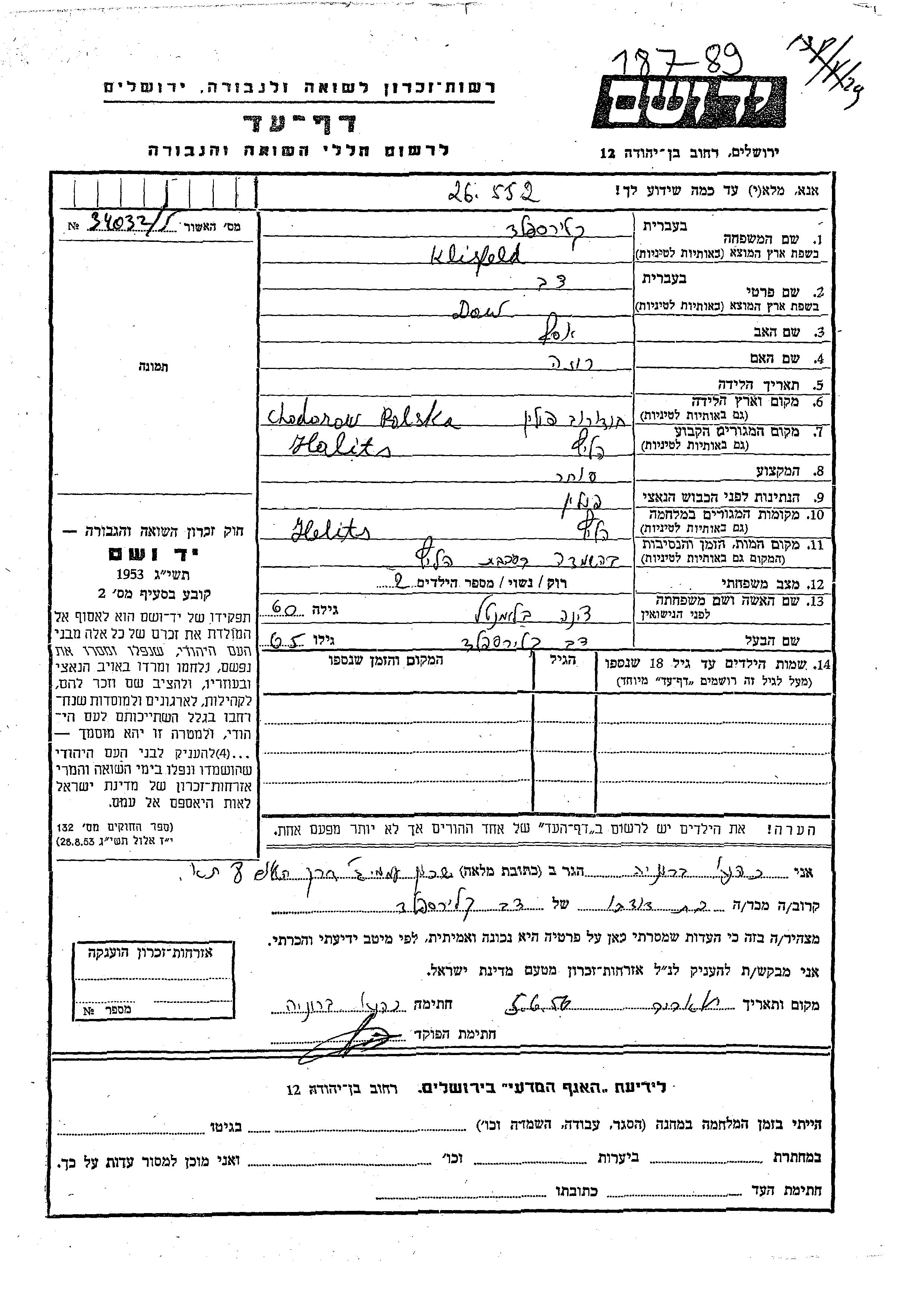 Klisfeld Dow Helitch, Pologne Feuille de témoignage