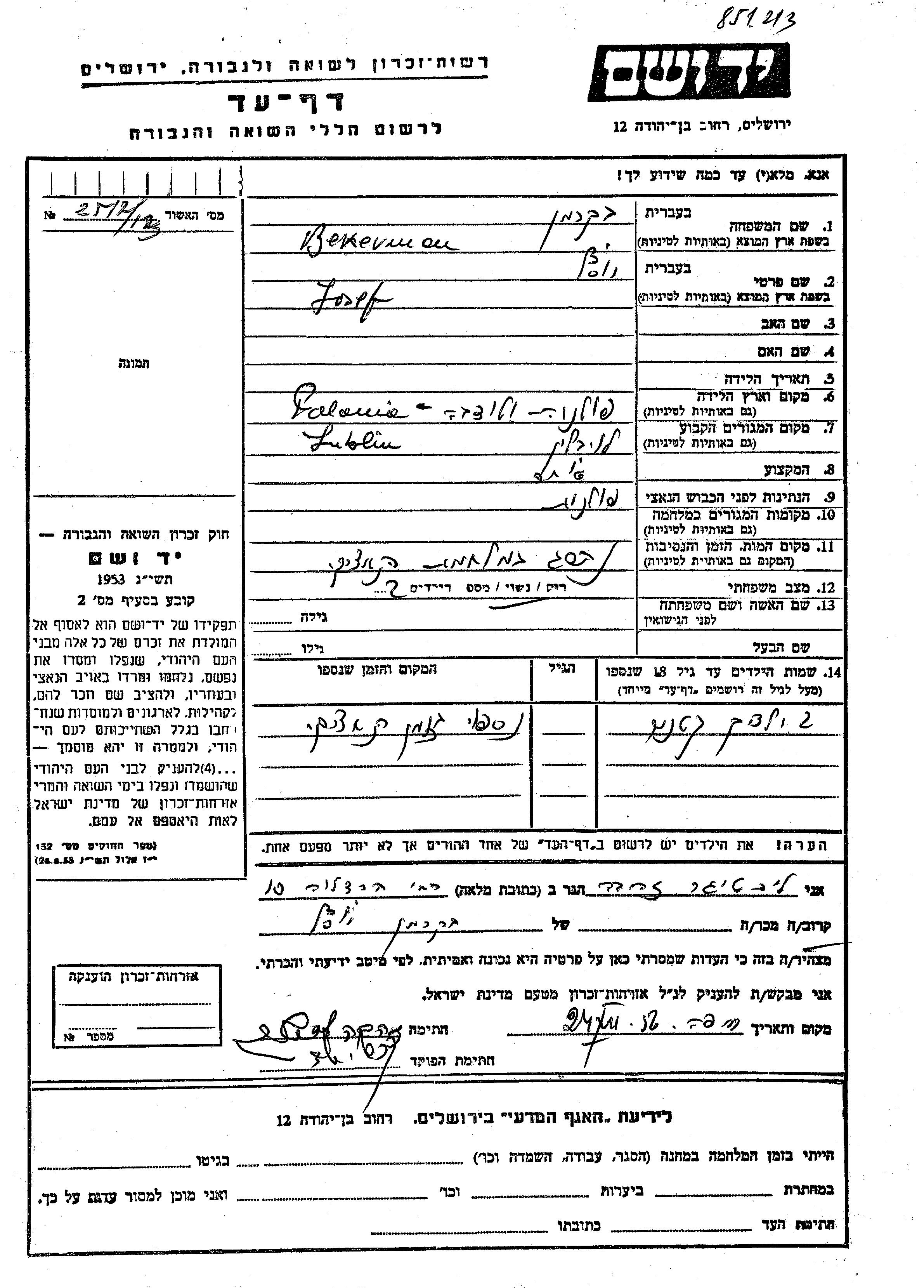 Bekerman Yosef Lublin, Pologne Feuille de témoignage