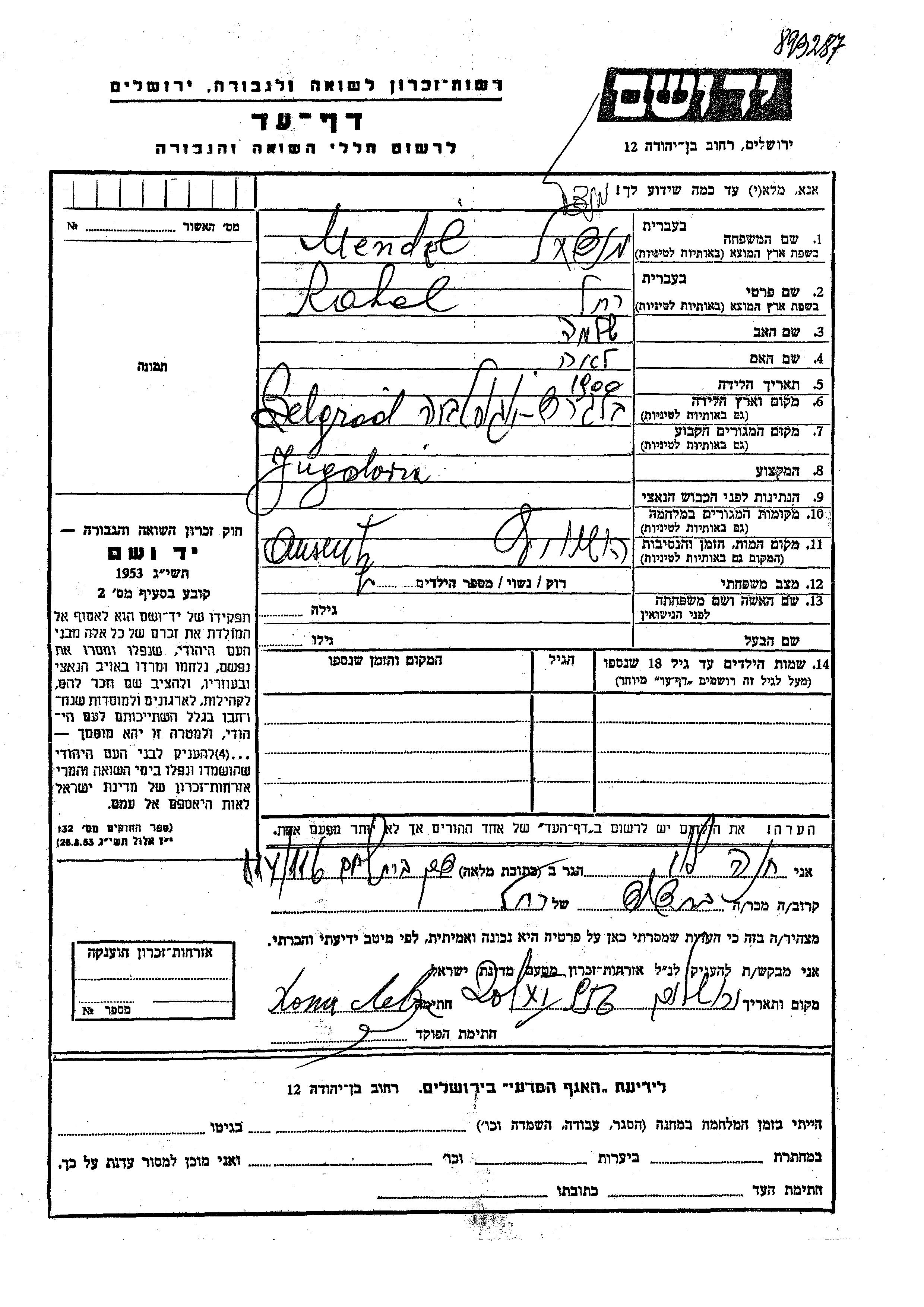 Mendel Rahel 1900 endroit inconnu, Feuille de témoignage