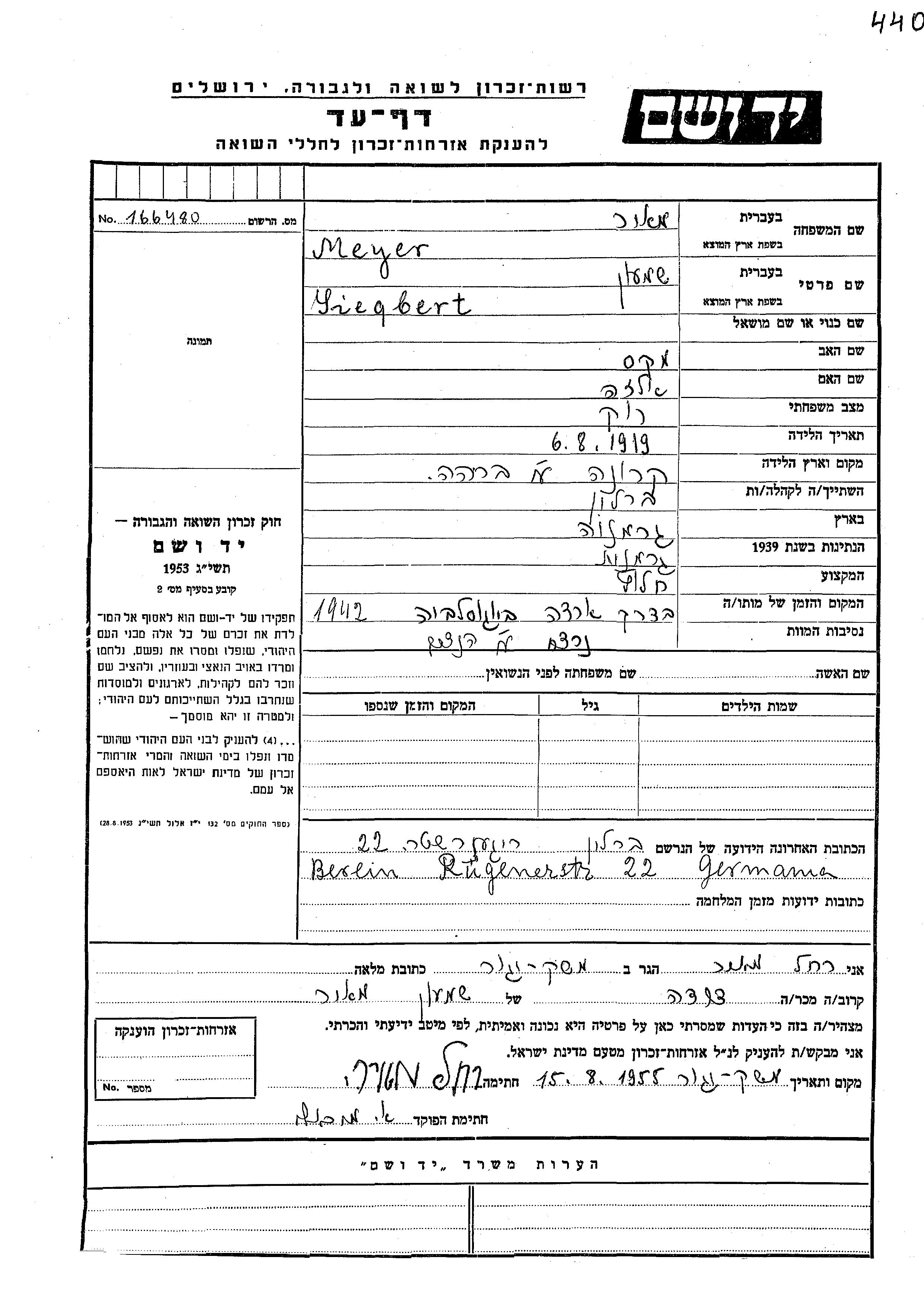 Meyer Siegbert Shimon 1919 Berlin, Allemagne Feuille de témoignage