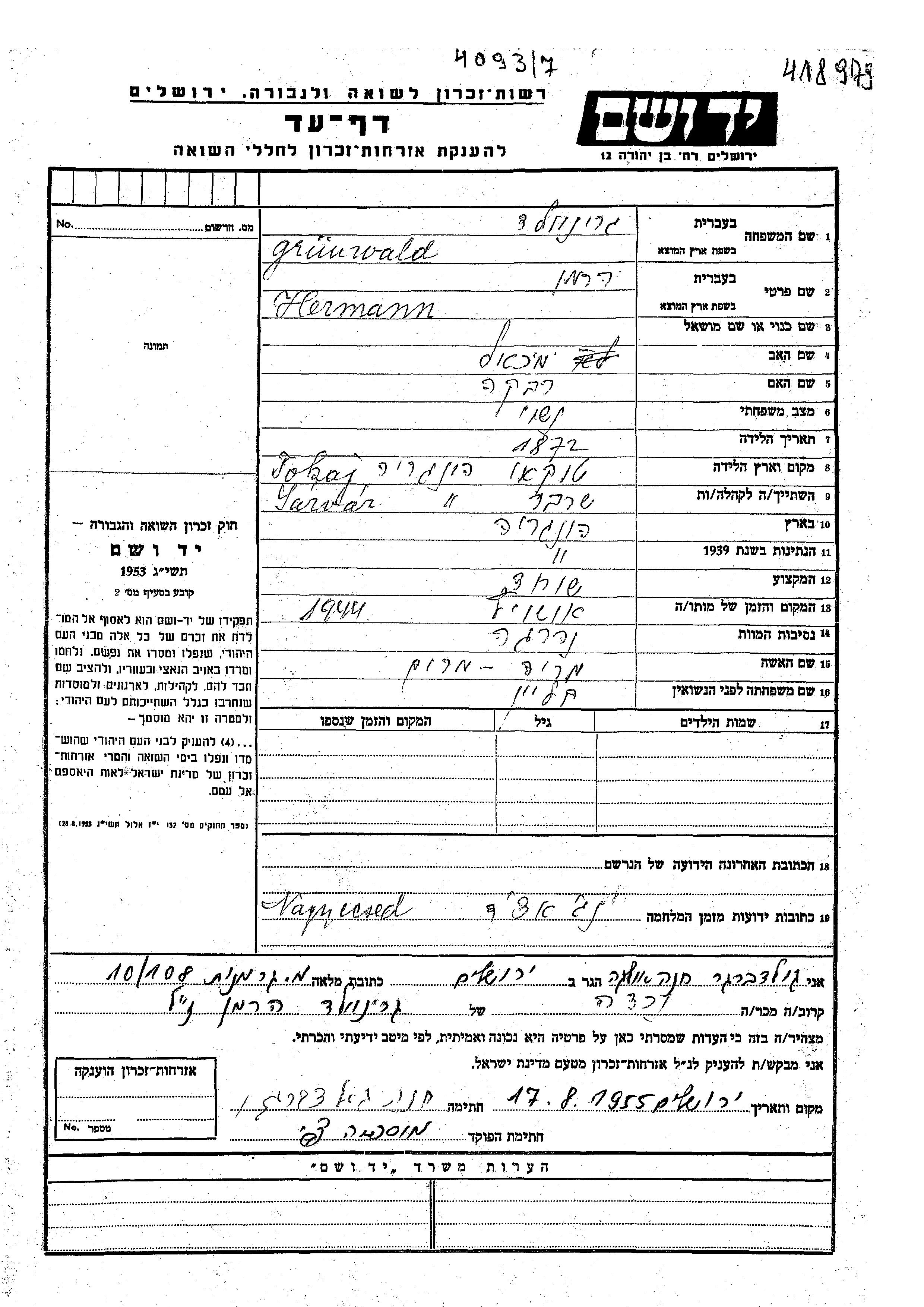 Hermann Gruenwald est né à Tokaj, Hongrie en 1872, fils de Mikhael et de Rivka. Il était Abatteur rituel et Mariée à Maria Miriam née Klein. Avant la seconde guerre mondiale il vivait à Sarvar, Hongrie. Au cours de la guerre, il était à Nagy Ecsed, Hongrie.