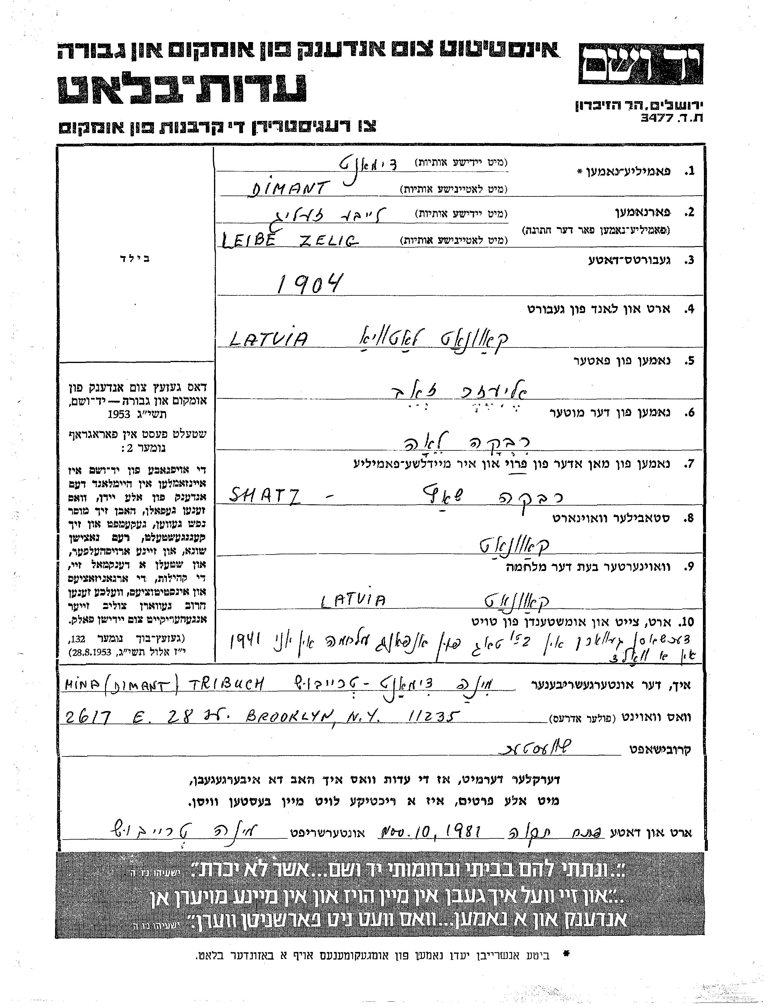 Diamant Leibe Zelig 1904 Kaunata, Lettonie Feuille de témoignage