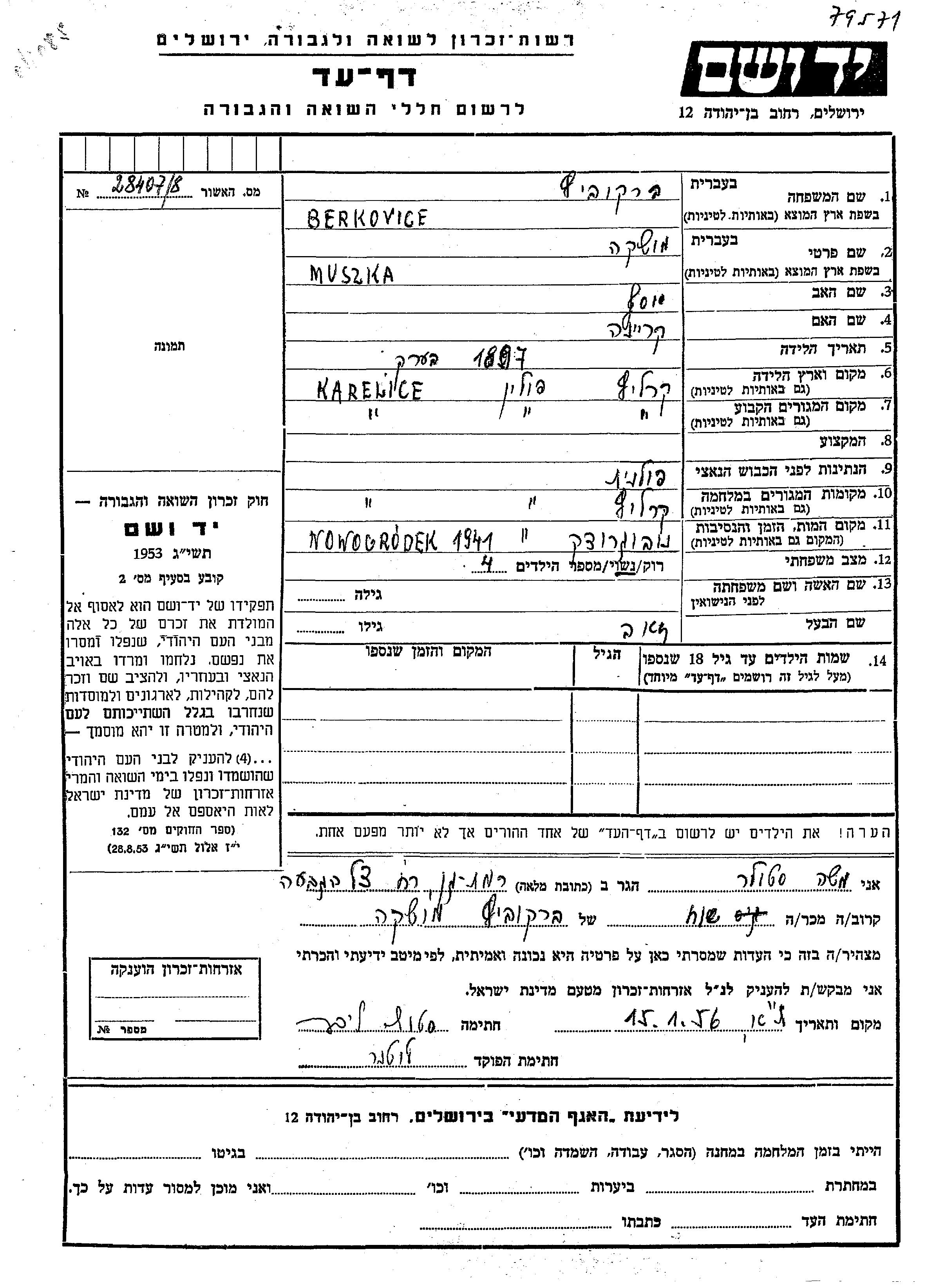 Muszka Berkovice est né à Karelic, Pologne en 1897, fils de Yosef et de Kreina. Il était Mariée à Zeev. Avant la seconde guerre mondiale il vivait à Karelic, Pologne. Au cours de la guerre, il était à Karelic, Pologne.