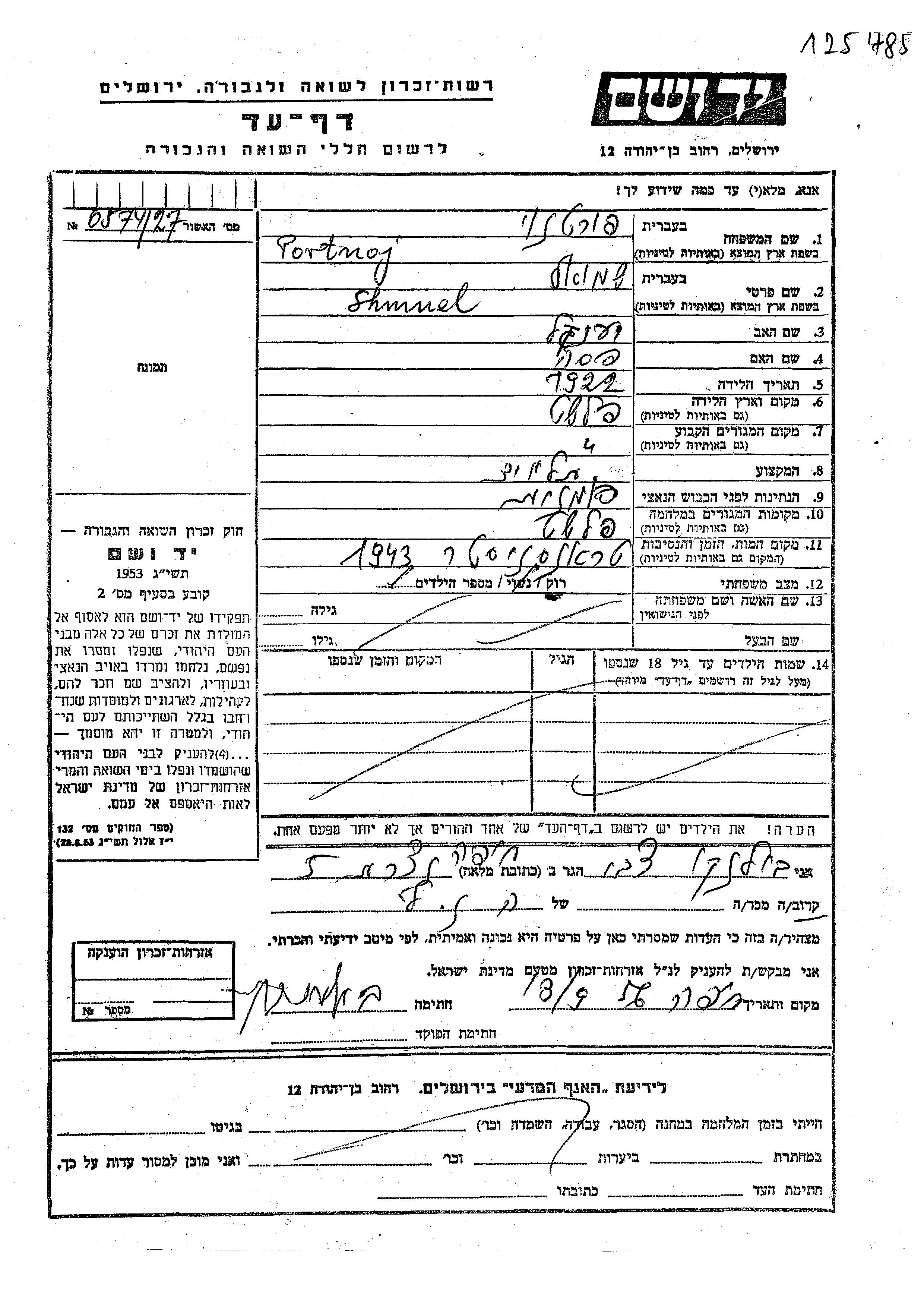 Portnoj Shmuel 1922 Falesti, Roumanie Feuille de témoignage