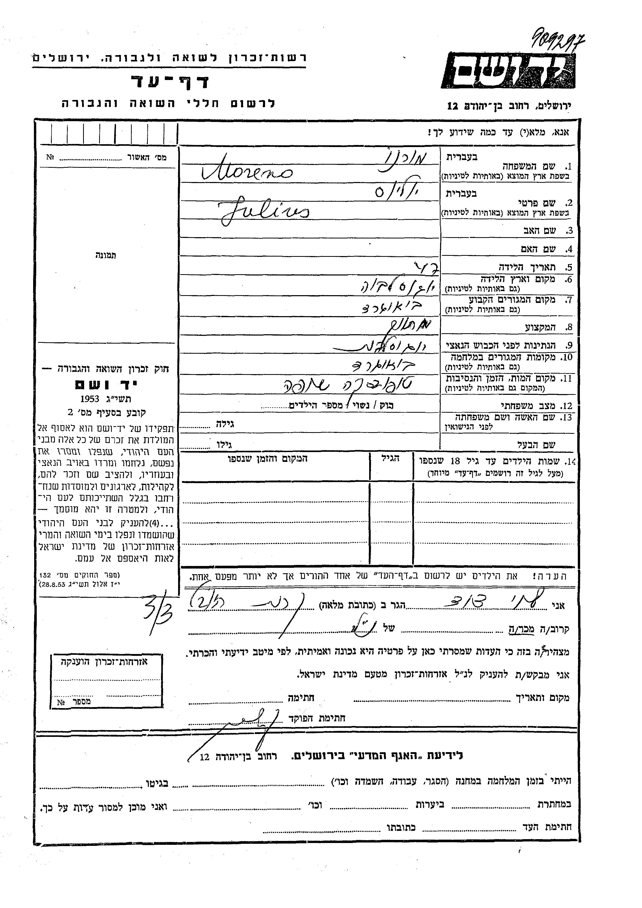 Moreno Yulius Beograd, Yugoslavie Feuille de témoignage