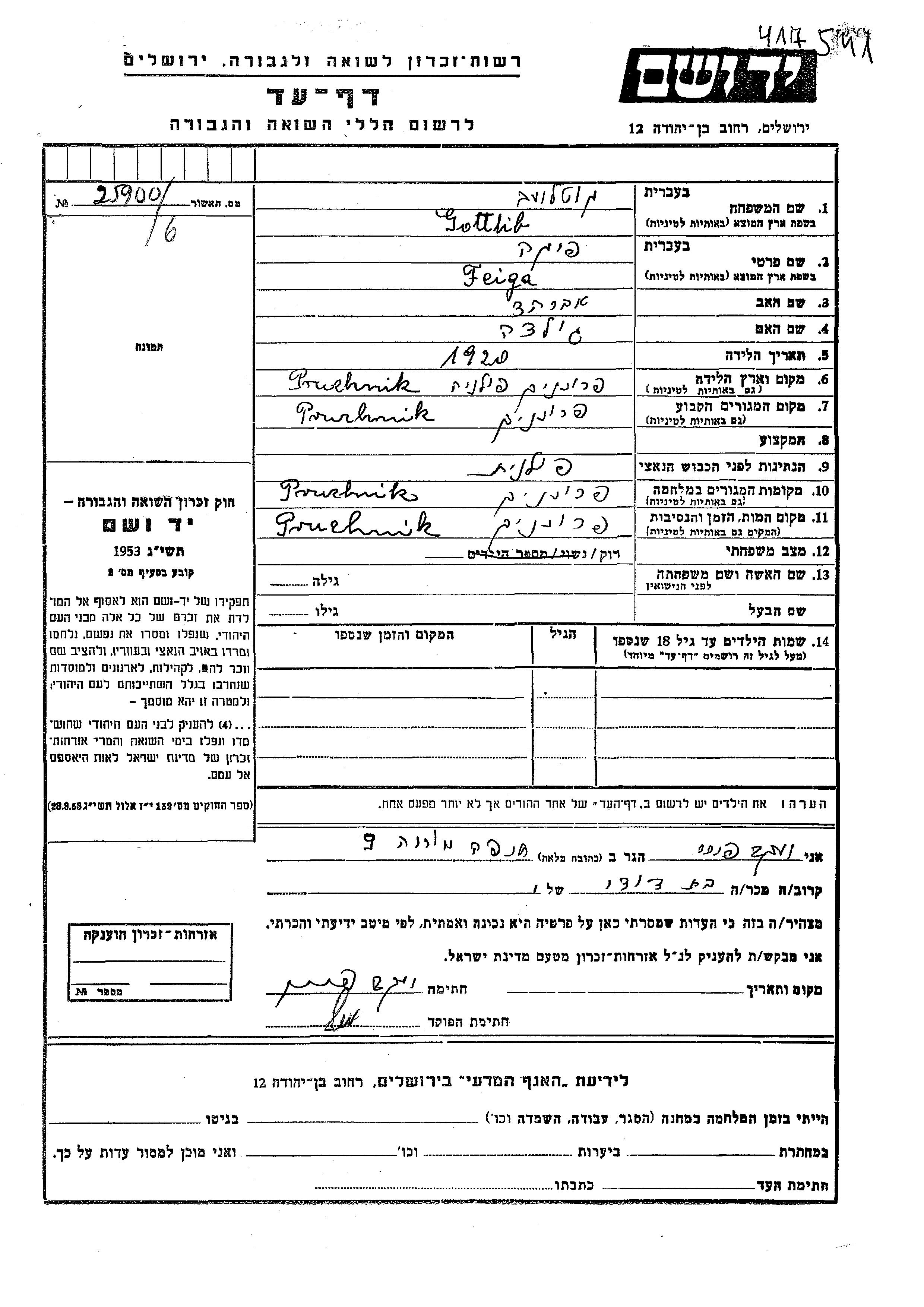 Gottlib Feiga 1920 Pruchnik, Pologne Feuille de témoignage