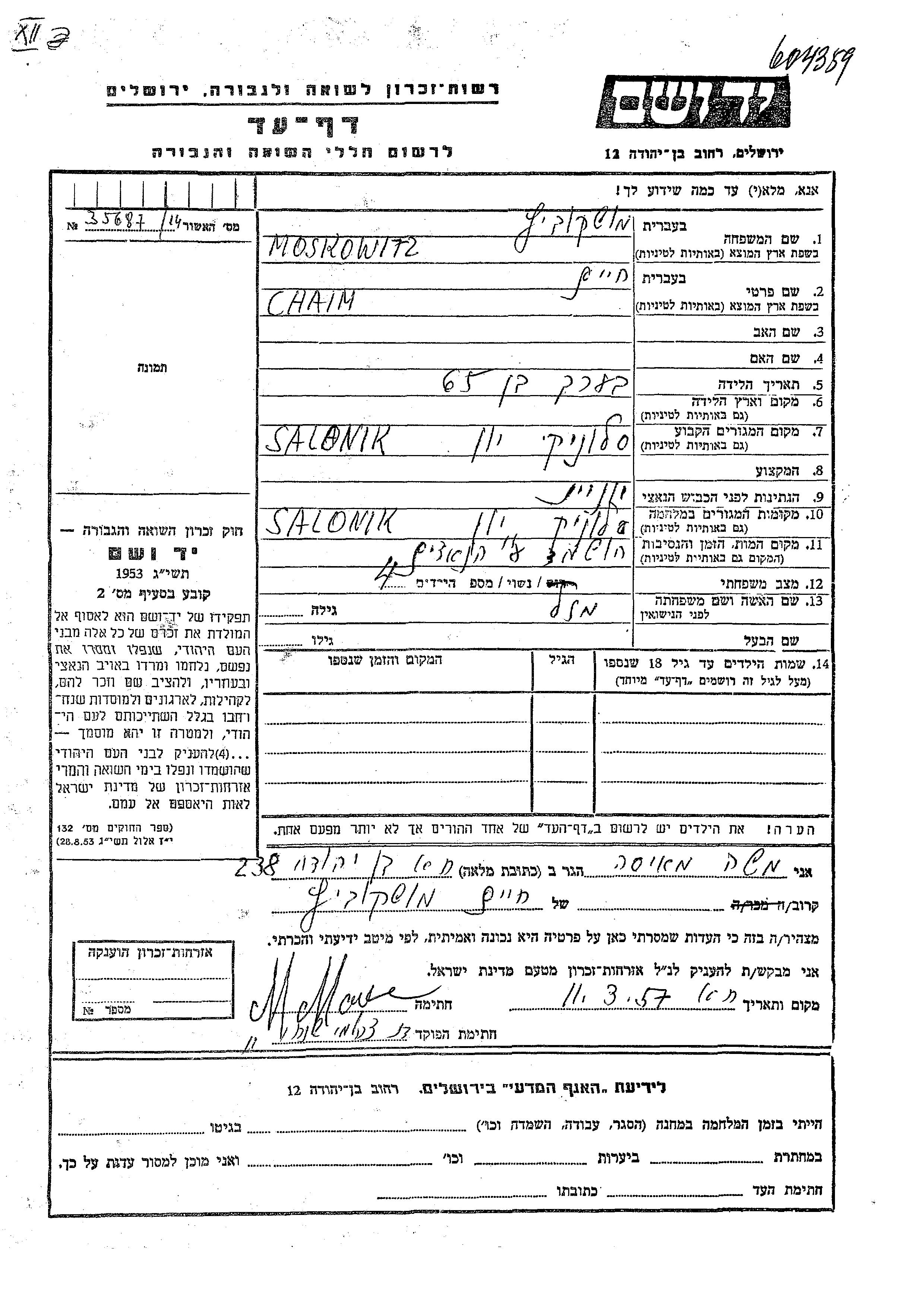 Chaim Moskowitz. Il était Mariée à Mazal. Avant la seconde guerre mondiale il vivait à Salonika, Grèce. Au cours de la guerre, il était à Salonika, Grèce.