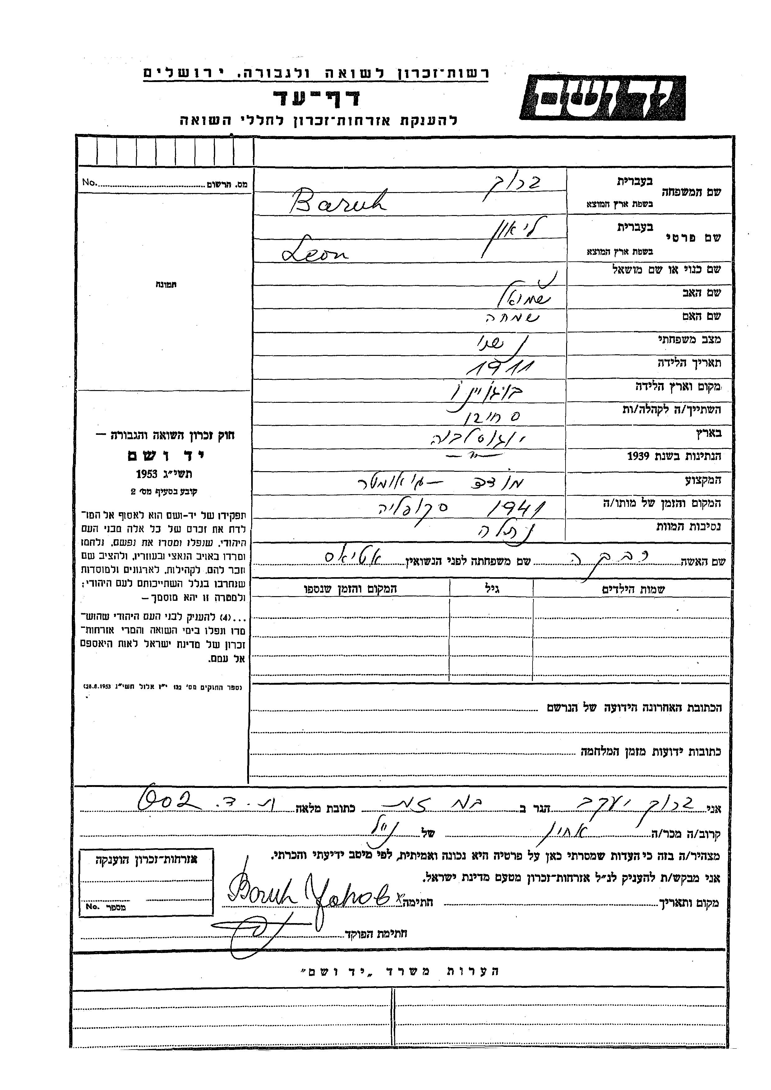 Leon Baruh est né à Bugojno, Yugoslavie en 1911, fils de Shmuel et de Simkha. Il était Arpenteur et Mariée à Rivka née Atias. Avant la seconde guerre mondiale il vivait à Sarajevo, Yugoslavie.