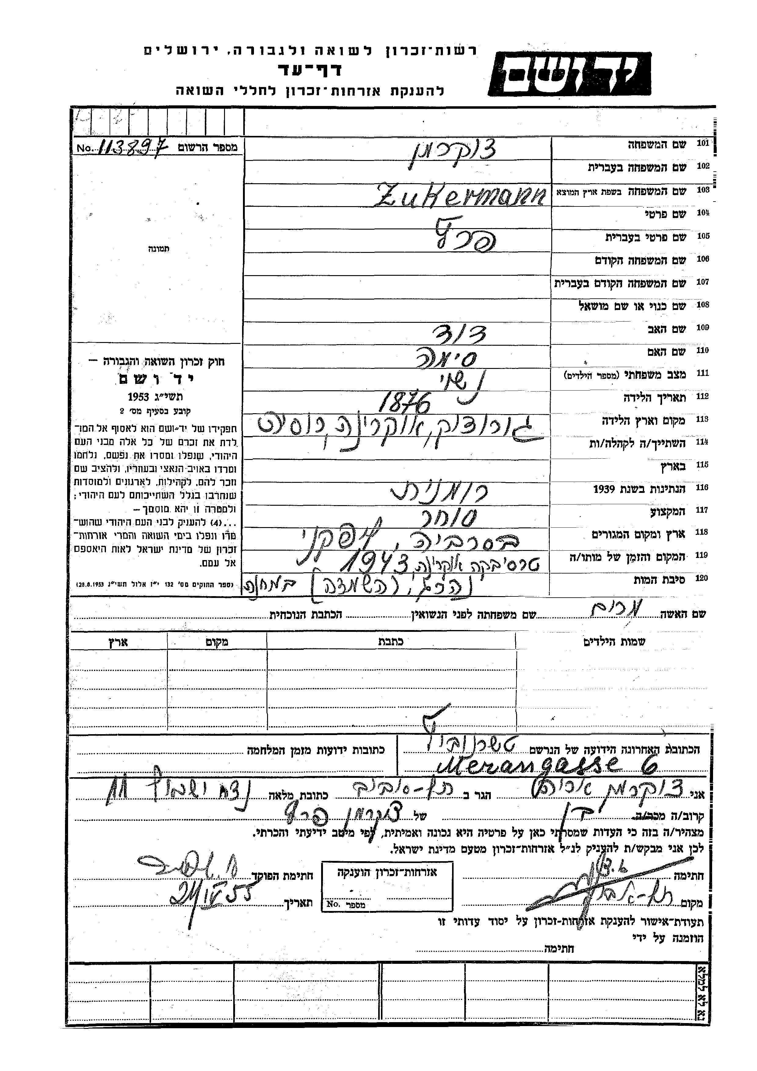 Peretz Zukermann est né à Gorodok, Ukraine (URSS) en 1876, fils de David et de Sima. Il était Commerçant/e et Mariée à Miriam. Avant la seconde guerre mondiale il vivait à Lipkani, Roumanie. Au cours de la guerre, il était à Czernowitz, Roumanie.