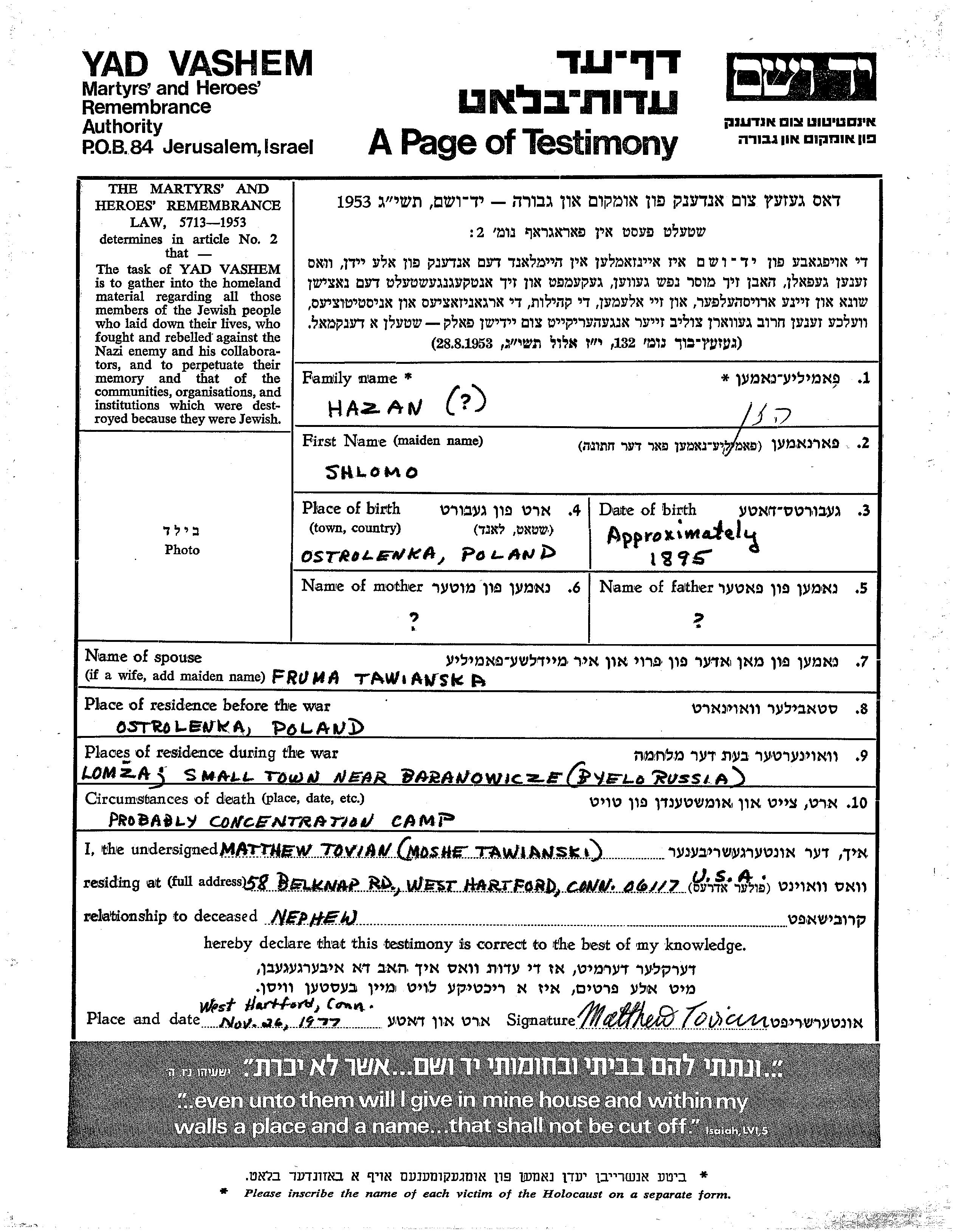 Hazan Shlomo 1895 Ostrolenka, Pologne Feuille de témoignage