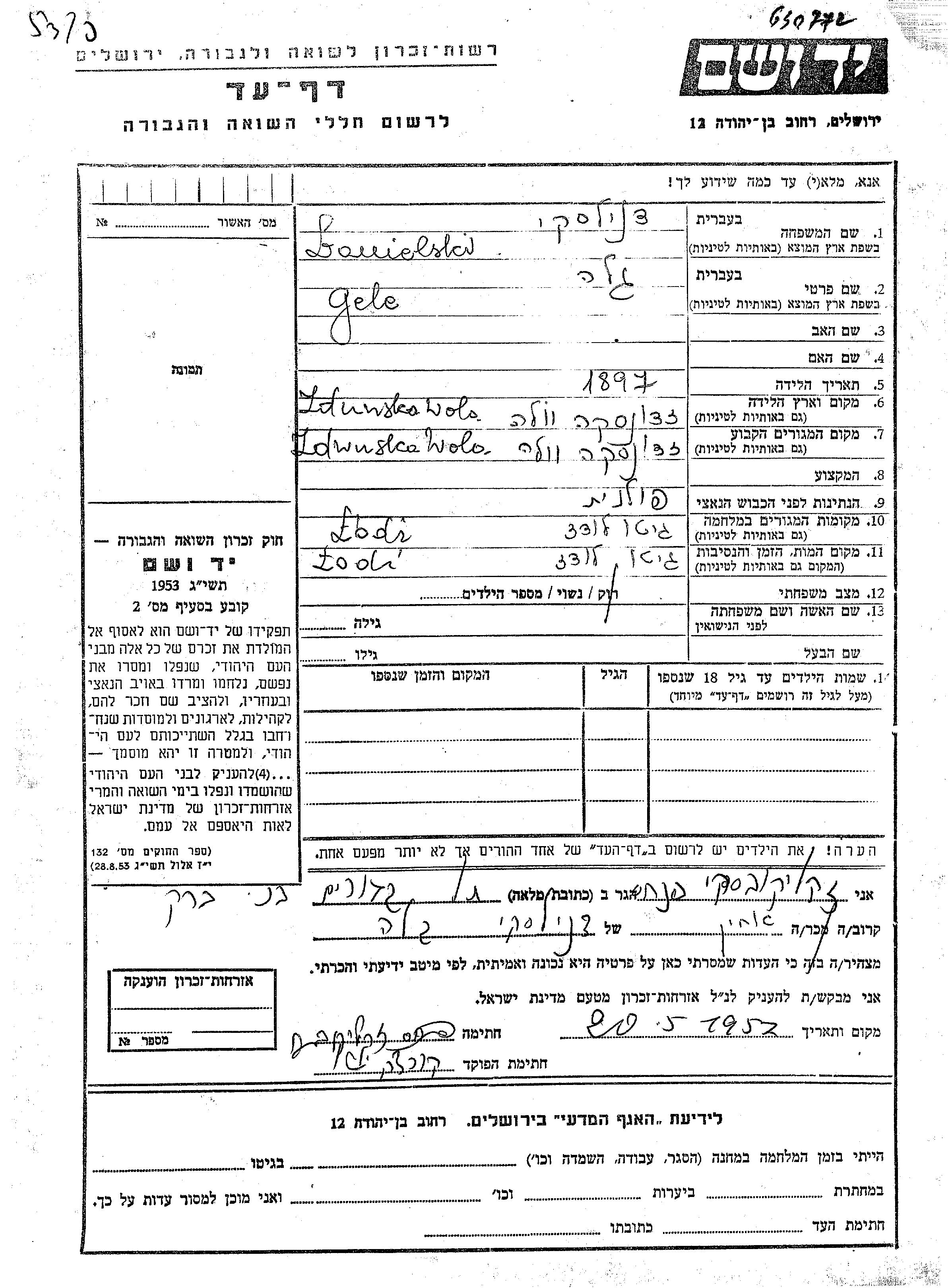 Danielski Gela 1897 Zdunska Wola, Pologne Feuille de témoignage