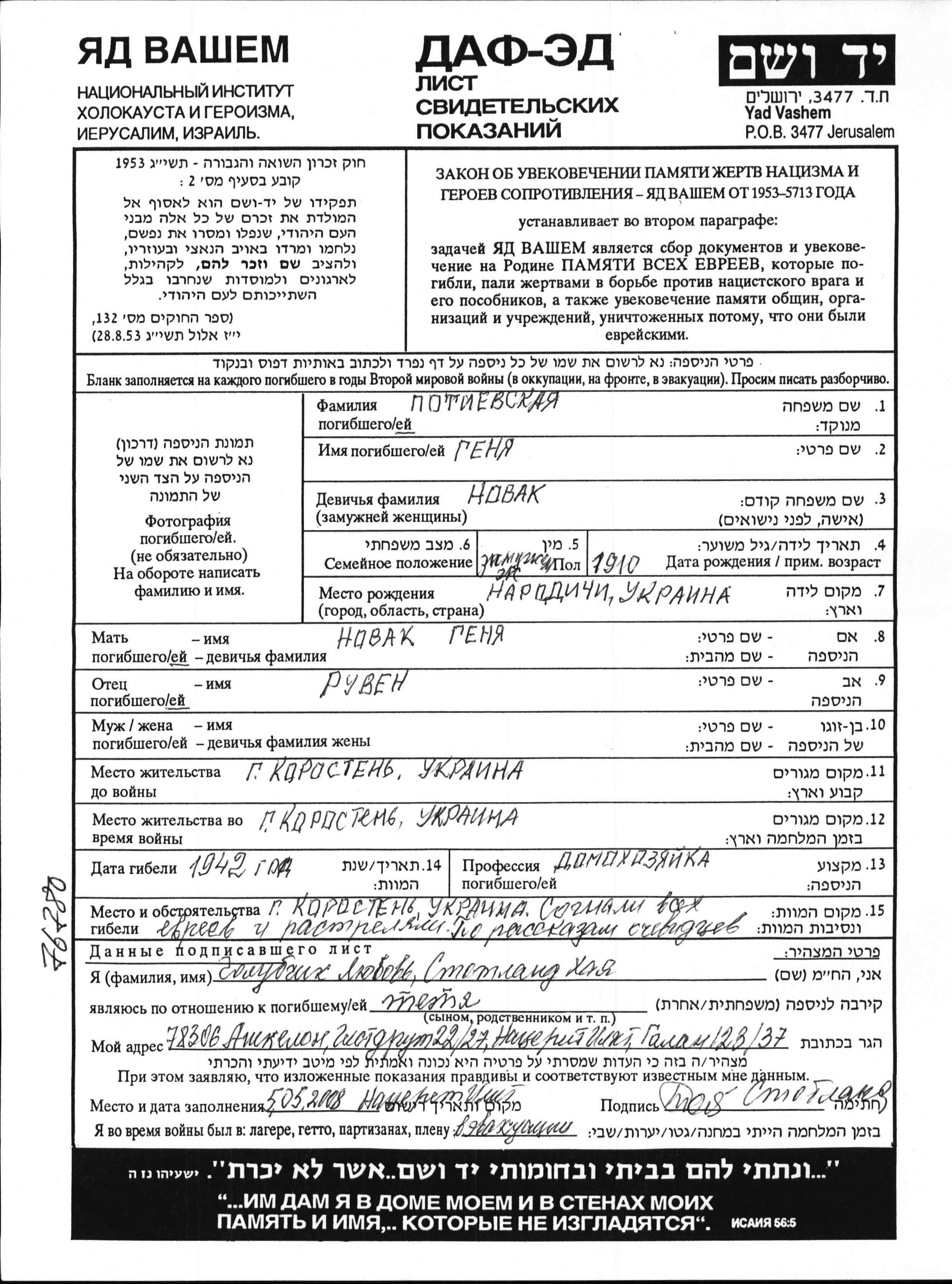 Potiyevskaya Genya 1910 Korosten, Ukraine (URSS) Feuille de témoignage