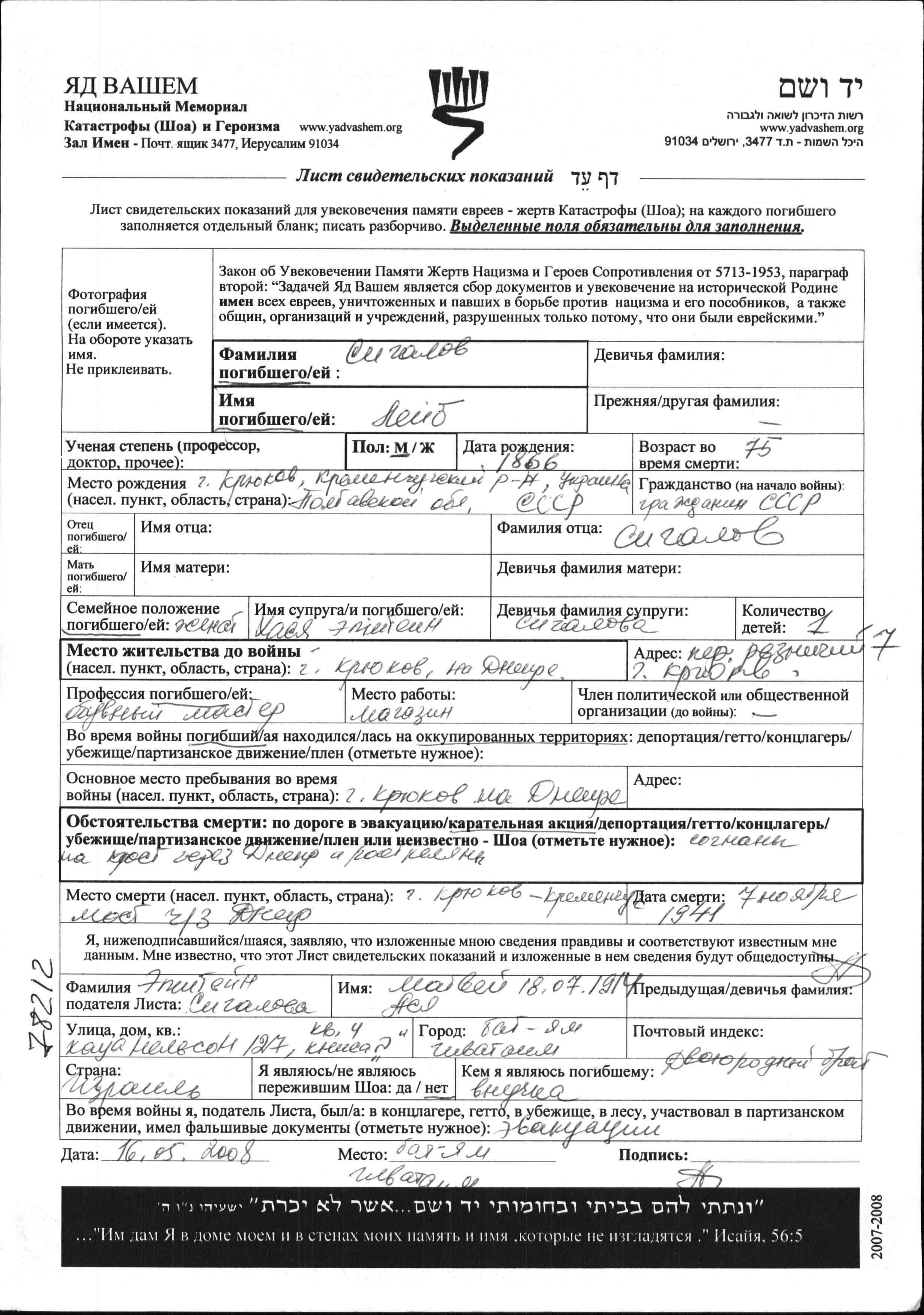 Leib a été assassiné pendant la Shoah. Lieu de la mort: Kryukov, Ukraine (URSS) en 07/11/1941.