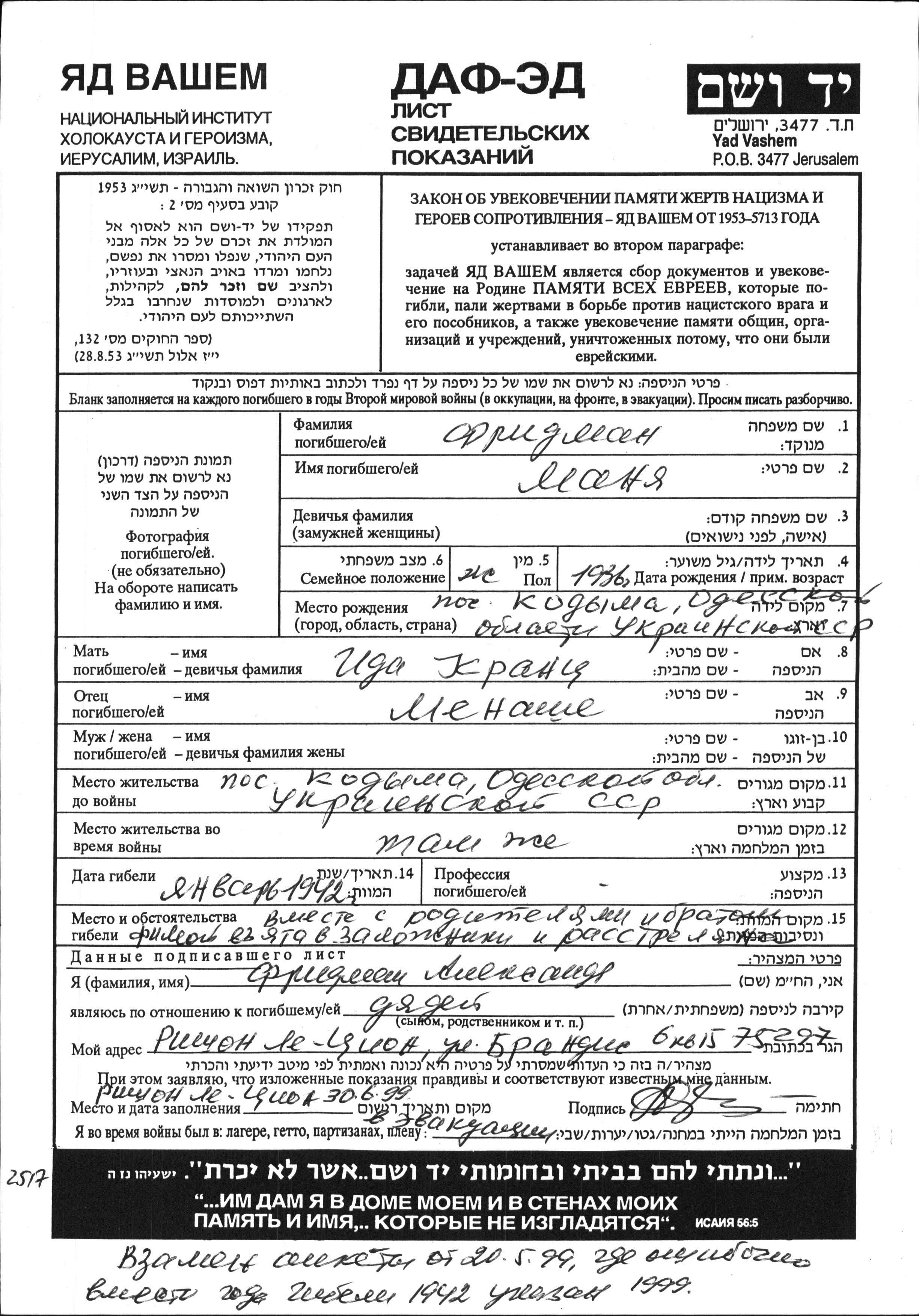 Fridman Mania 1936 Kodyma, Ukraine (URSS) Feuille de témoignage