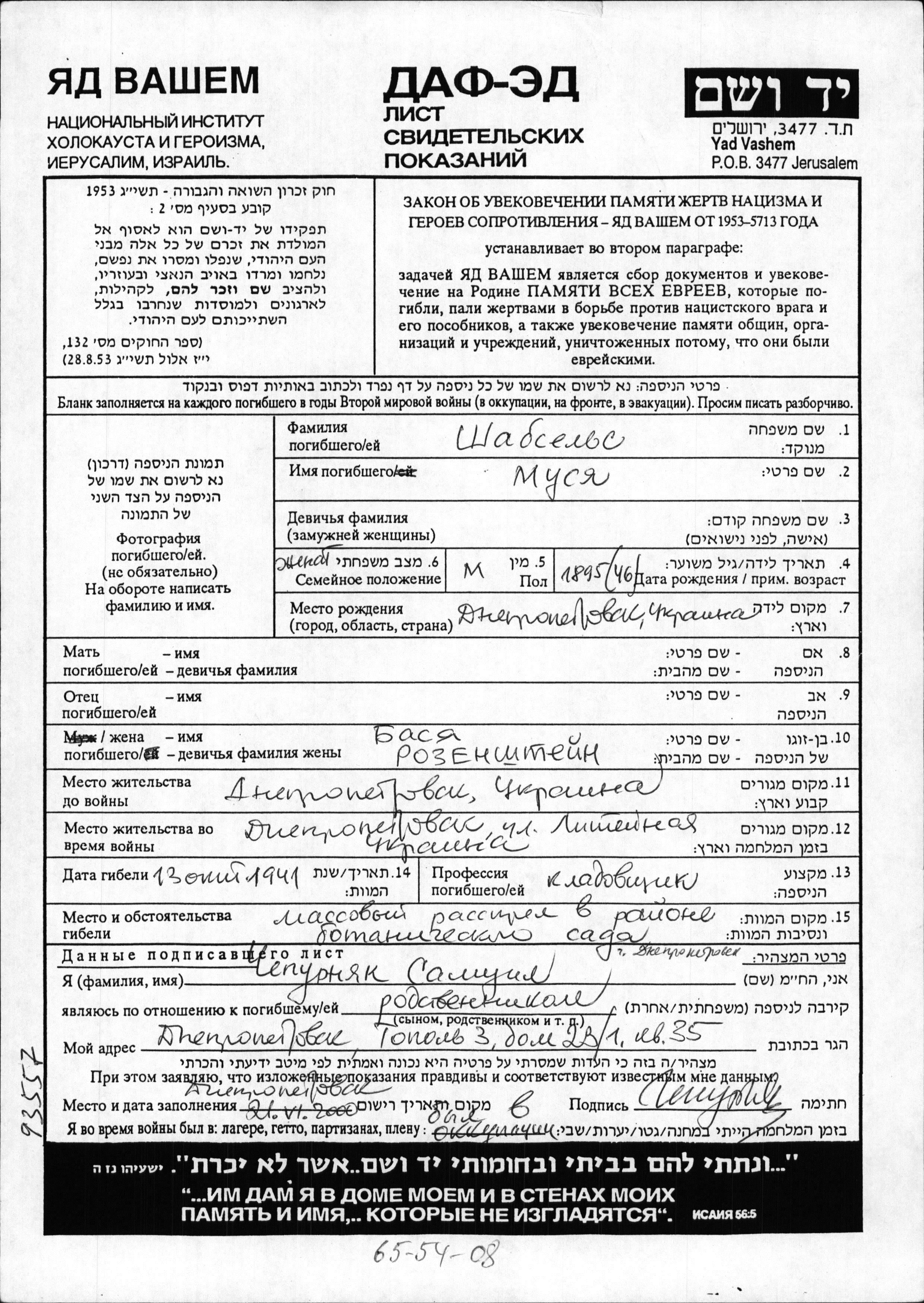 Shabsels Musya 1895 Dnepropetrovsk, Ukraine (URSS) Feuille de témoignage