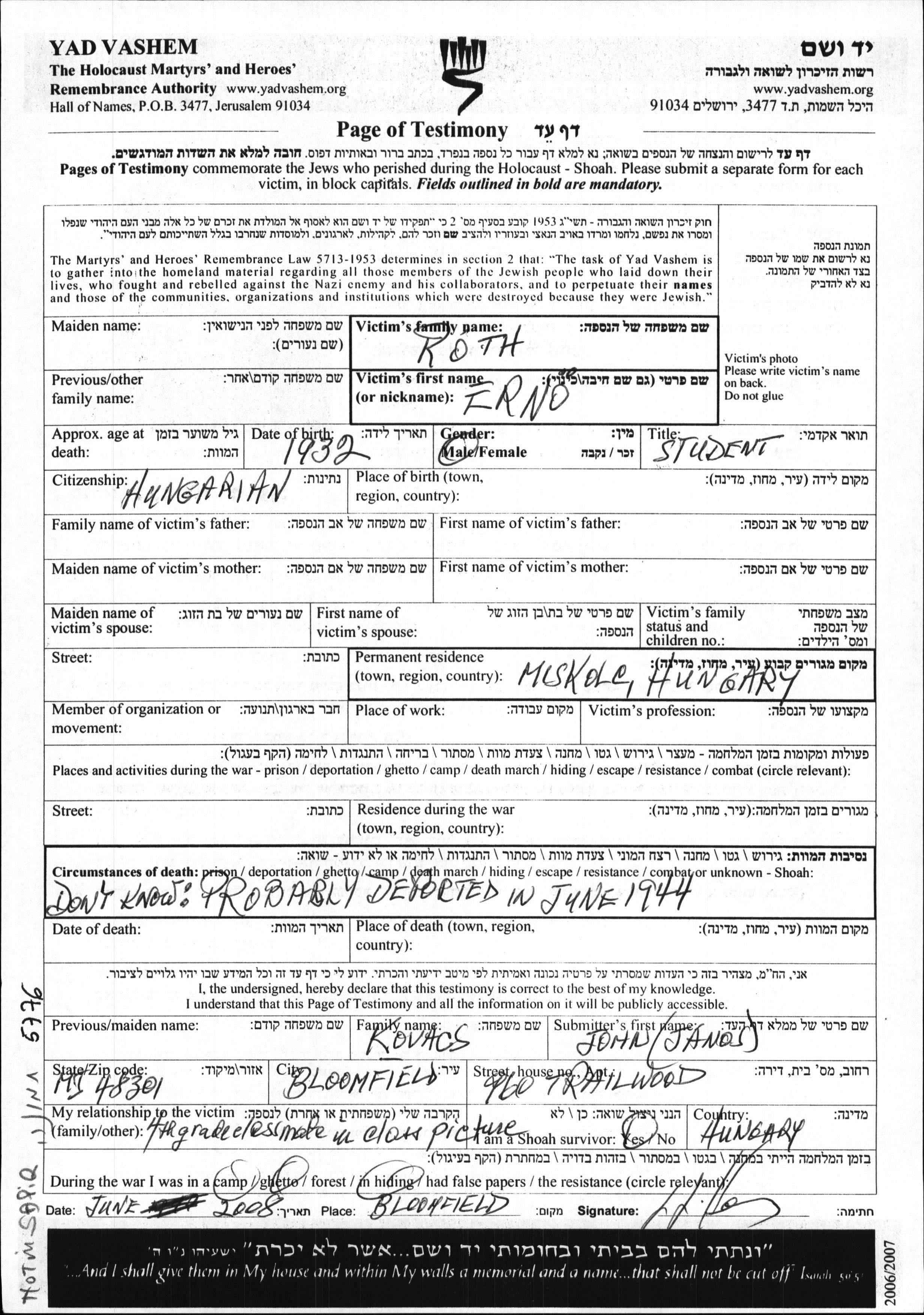Koth Erno 1932 Miskolc, Hongrie Feuille de témoignage