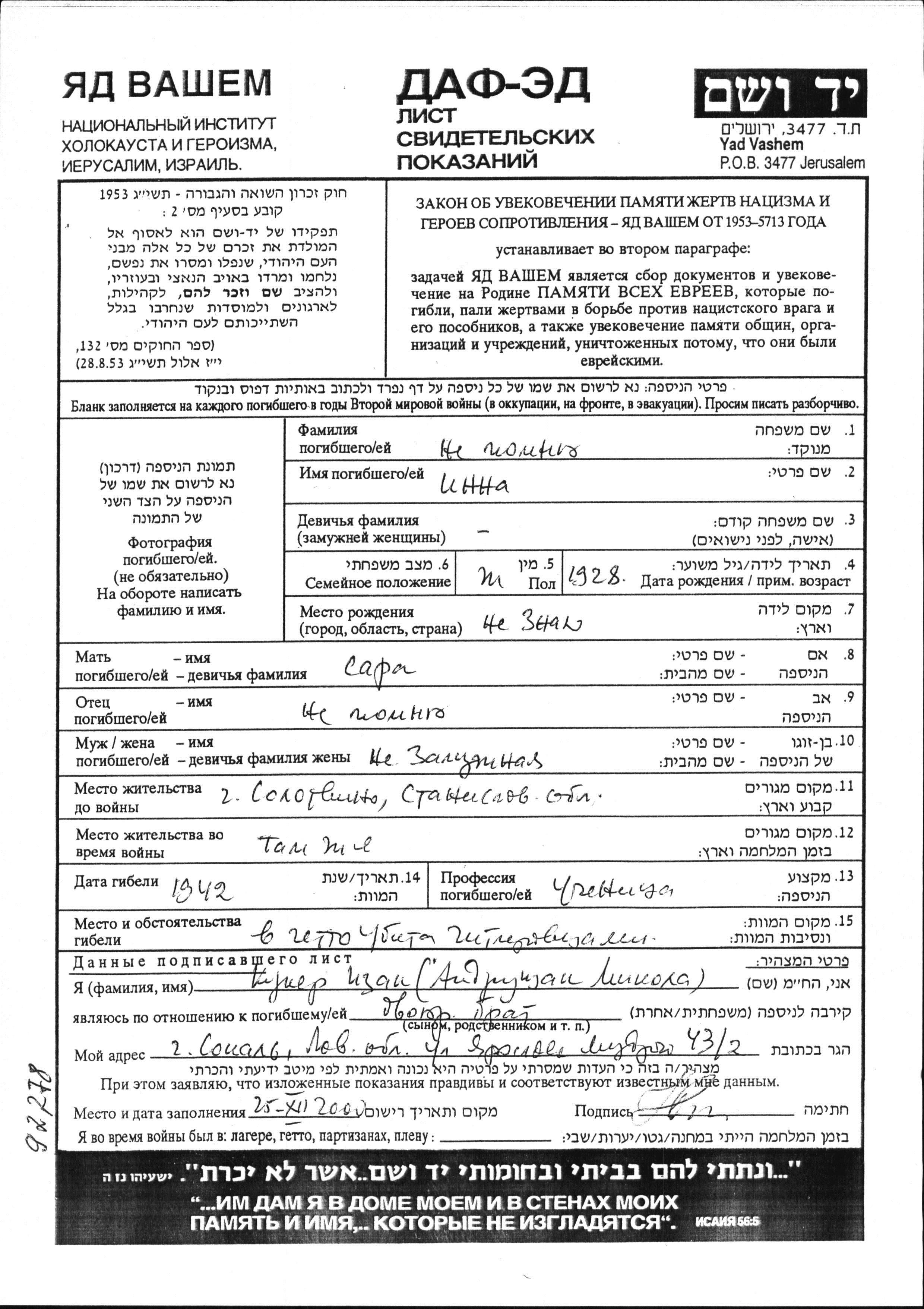 Au cours de la Shoah, les Juifs ont été assassinés de diverses façons : gazage, exécution par balle, immolation, noyade, enterrés vivants, épuisement par les travaux forcés, affamement, maladies et épidémies, privation de soins médicaux et de mesures de salubrité, etc. Certains Juifs ont mis fin à leur vie pour échapper à l'arrestation, aux persécutions ou aux souffrances permanentes et sans aucun espoir. Des dizaines de milliers de soldats juifs servant dans l’armée soviétique et capturés comme prisonniers de guerre furent sélectionnés comme juifs et assassinés. Beaucoup furent enregistrés comme «disparus au combat».