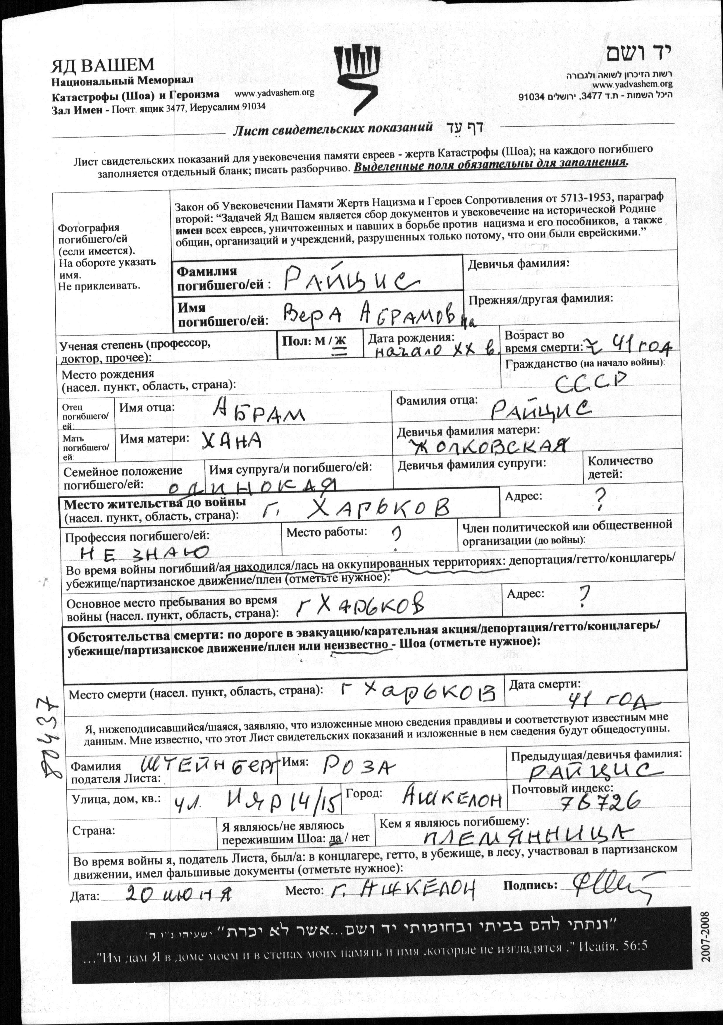 Au cours de la Shoah, les Juifs ont été assassinés de diverses façons : gazage, exécution par balle, immolation, noyade, enterrés vivants, épuisement par les travaux forcés, affamement, maladies et épidémies, privation de soins médicaux et de mesures de salubrité, etc. Certains Juifs ont mis fin à leur vie pour échapper à l'arrestation, aux persécutions ou aux souffrances permanentes et sans aucun espoir. Des dizaines de milliers de soldats juifs servant dans l’armée soviétique et capturés comme prisonniers de guerre furent sélectionnés comme juifs et assassinés. Beaucoup furent enregistrés comme «disparus au combat».