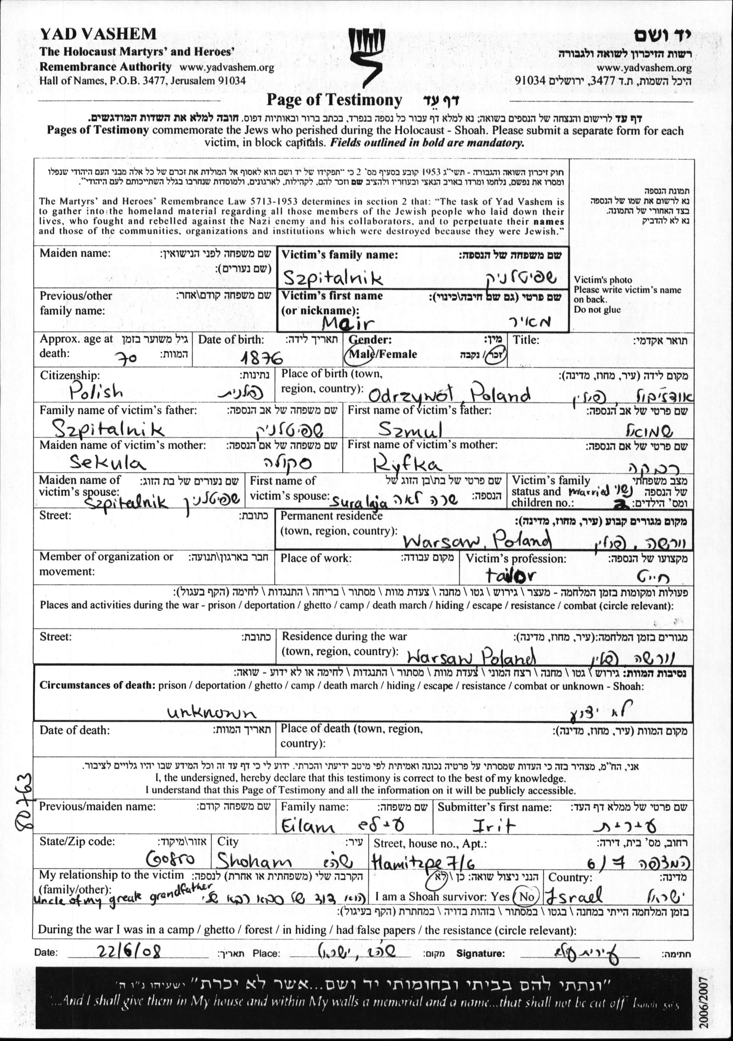 Meir Szpitalnik est né à Odrzywol, Pologne en 1876, fils de Szmul et de Ryfka née Sekula. Il était Tailleur et Mariée à Sura Laja. Avant la seconde guerre mondiale il vivait à Warszawa, Pologne. Au cours de la guerre, il était à Warszawa, Pologne.