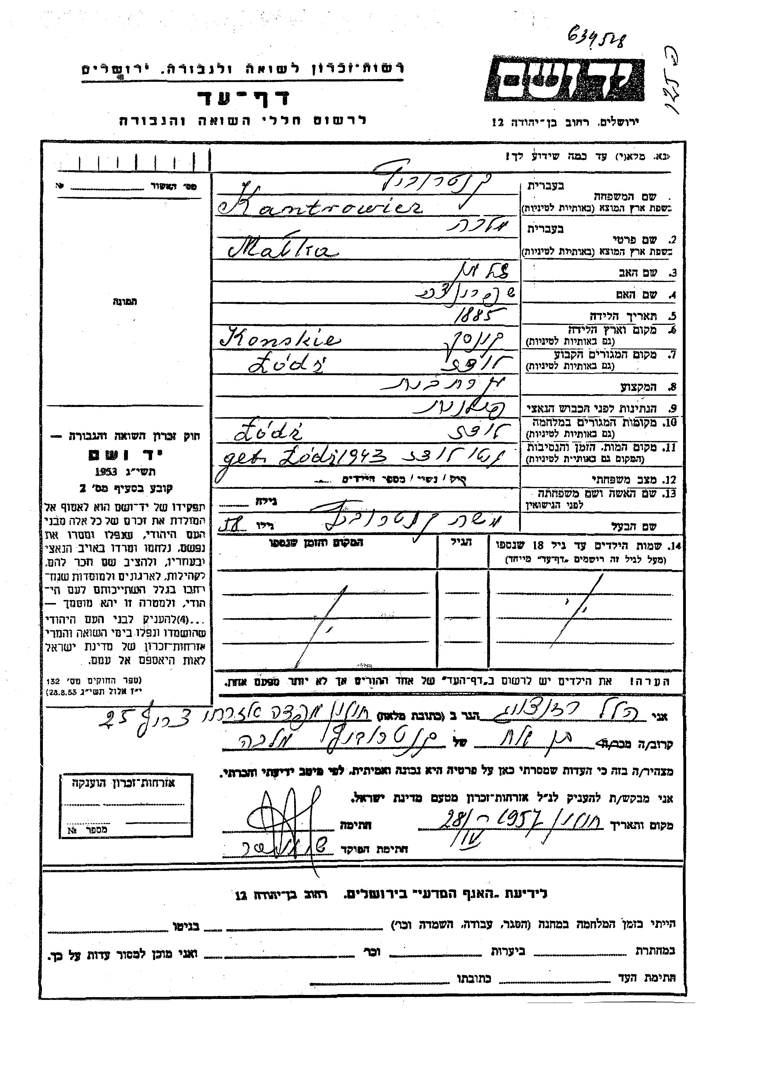 Malka Kantrowicz est née à Końskie, Pologne en 1885, fille de Zalman et de Shprintza. Elle était Femme au foyer et Mariée à Moshe. Avant la seconde guerre mondiale elle vivait à Lodz, Pologne. Pendant la guerre, elle était à Lodz, Pologne.