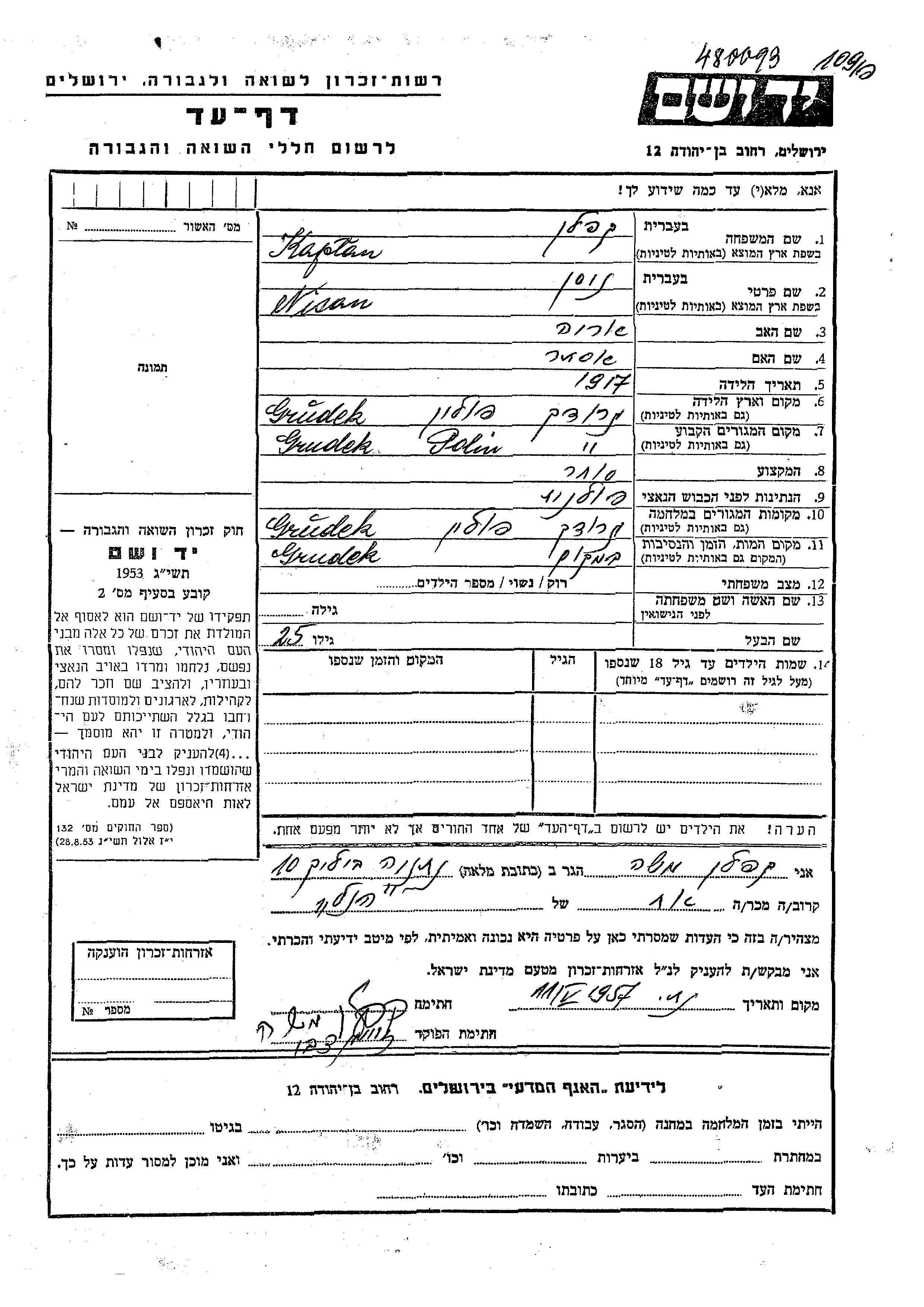 Nisan Kaplan est né à Gródek, Pologne en 1917, fils de Raisa et de Ester. Il était Commerçant/e. Avant la seconde guerre mondiale il vivait à Gródek, Pologne. Au cours de la guerre, il était à Gródek, Pologne.