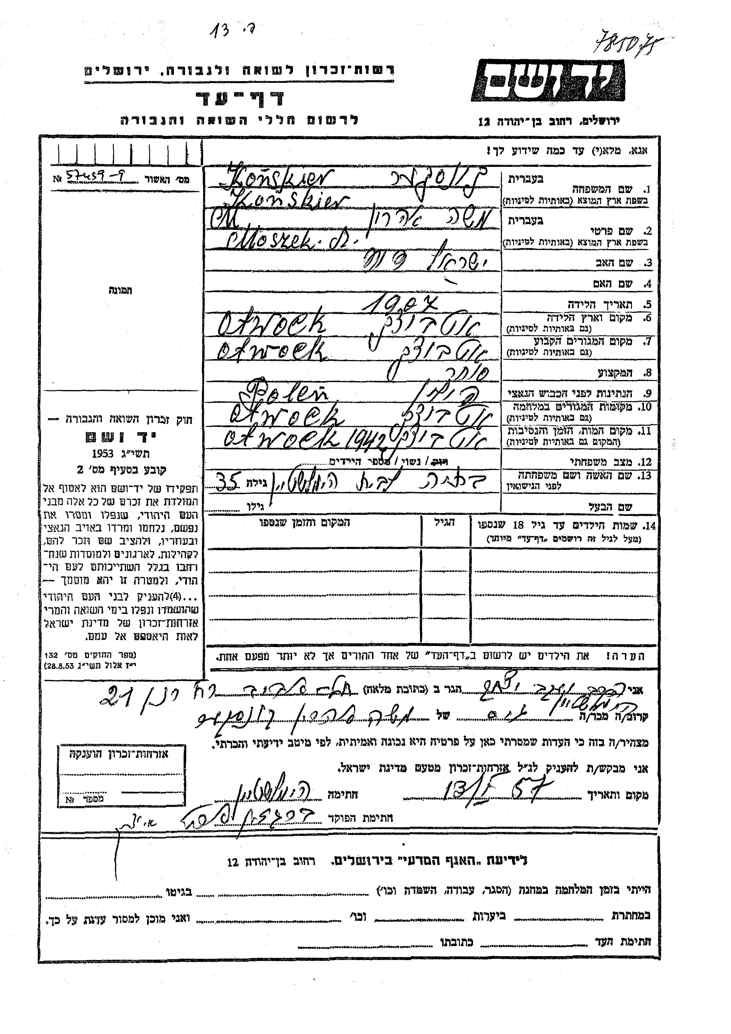 Konskier Moszek Aharon A 1907 Otwock, Pologne Feuille de témoignage
