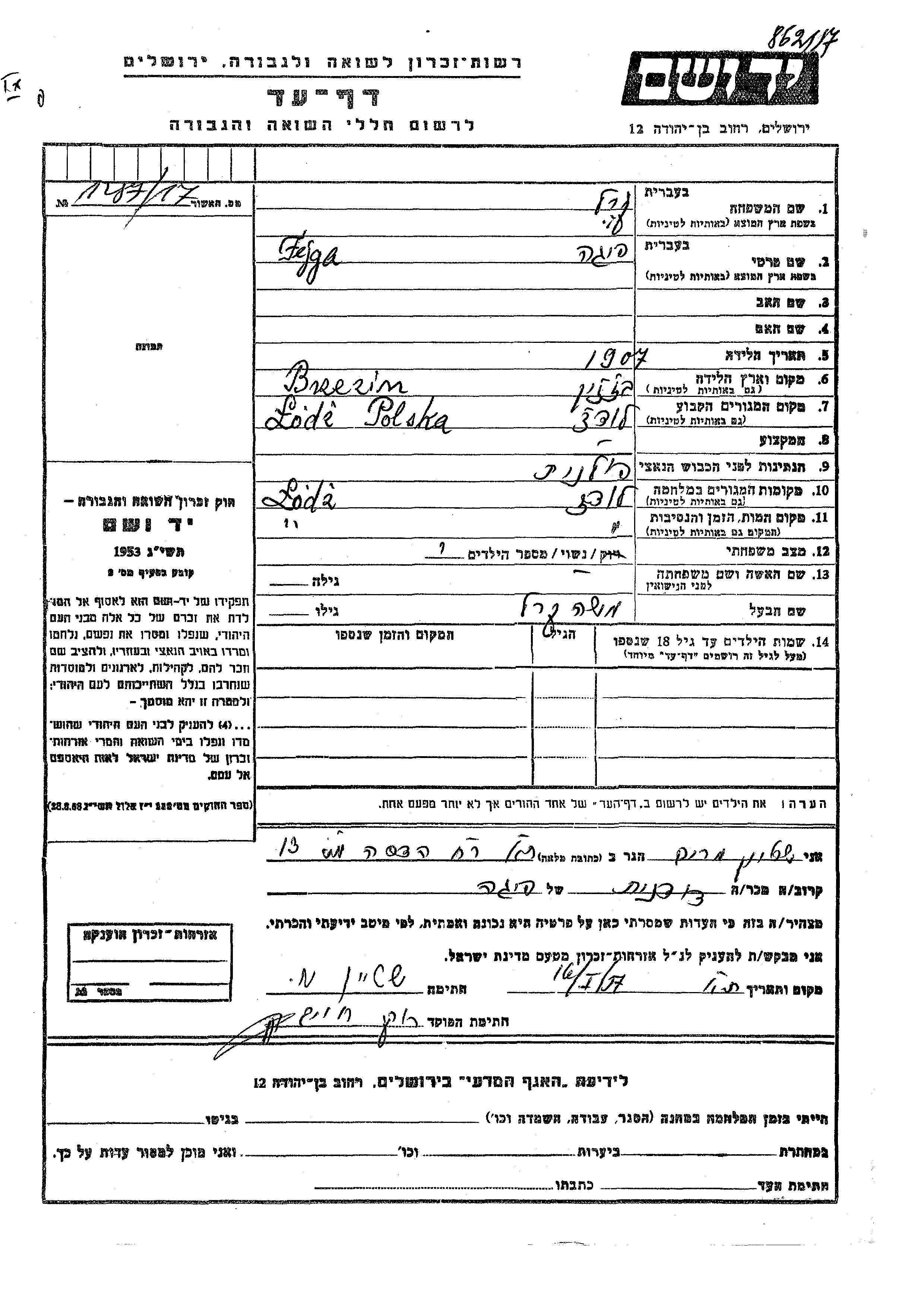 Yad Vashem - Pages of Testimony Names Memorial Collection