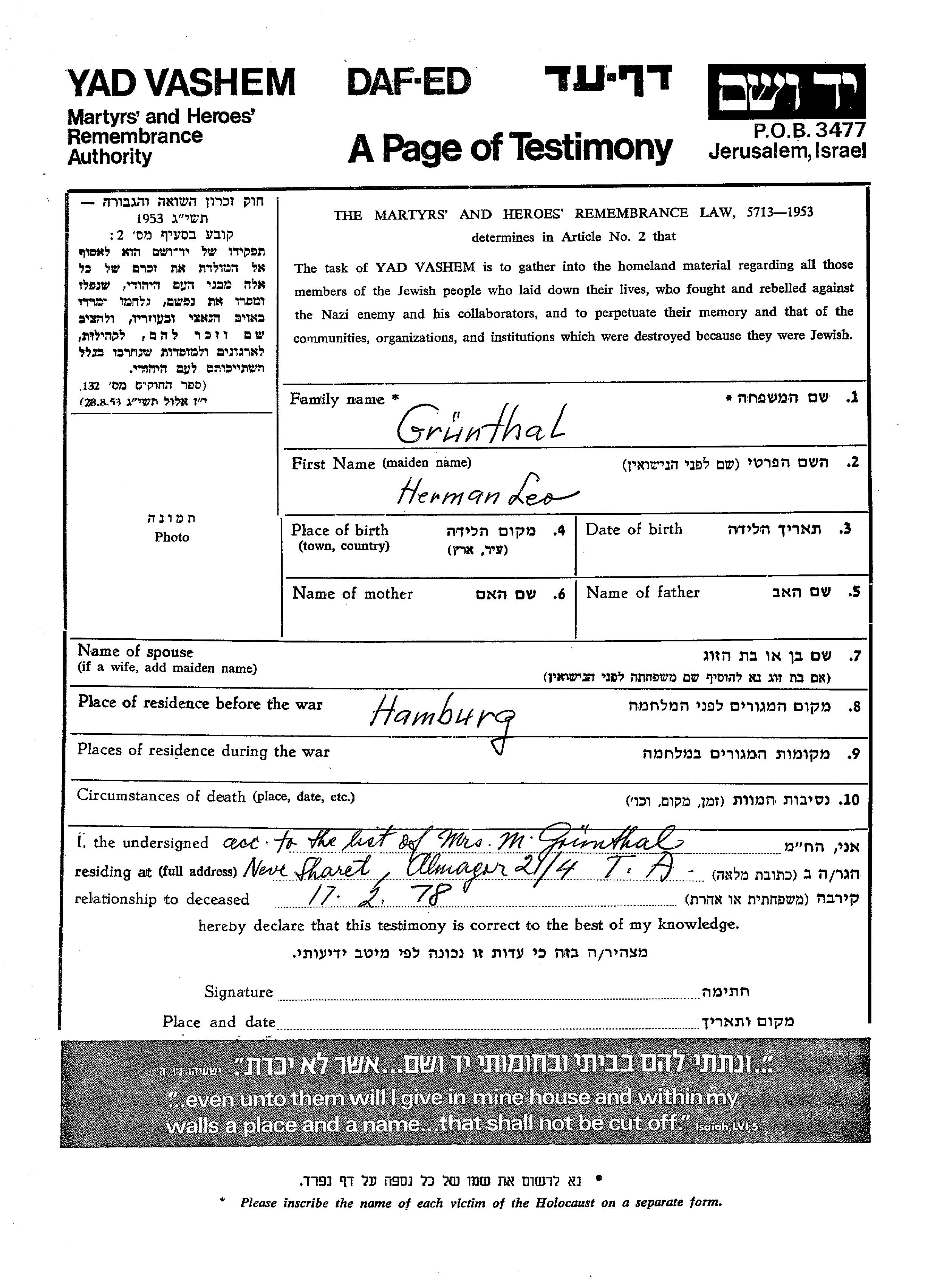 Herman Leo Gruenthal. Avant la seconde guerre mondiale il vivait à Hamburg, Allemagne.