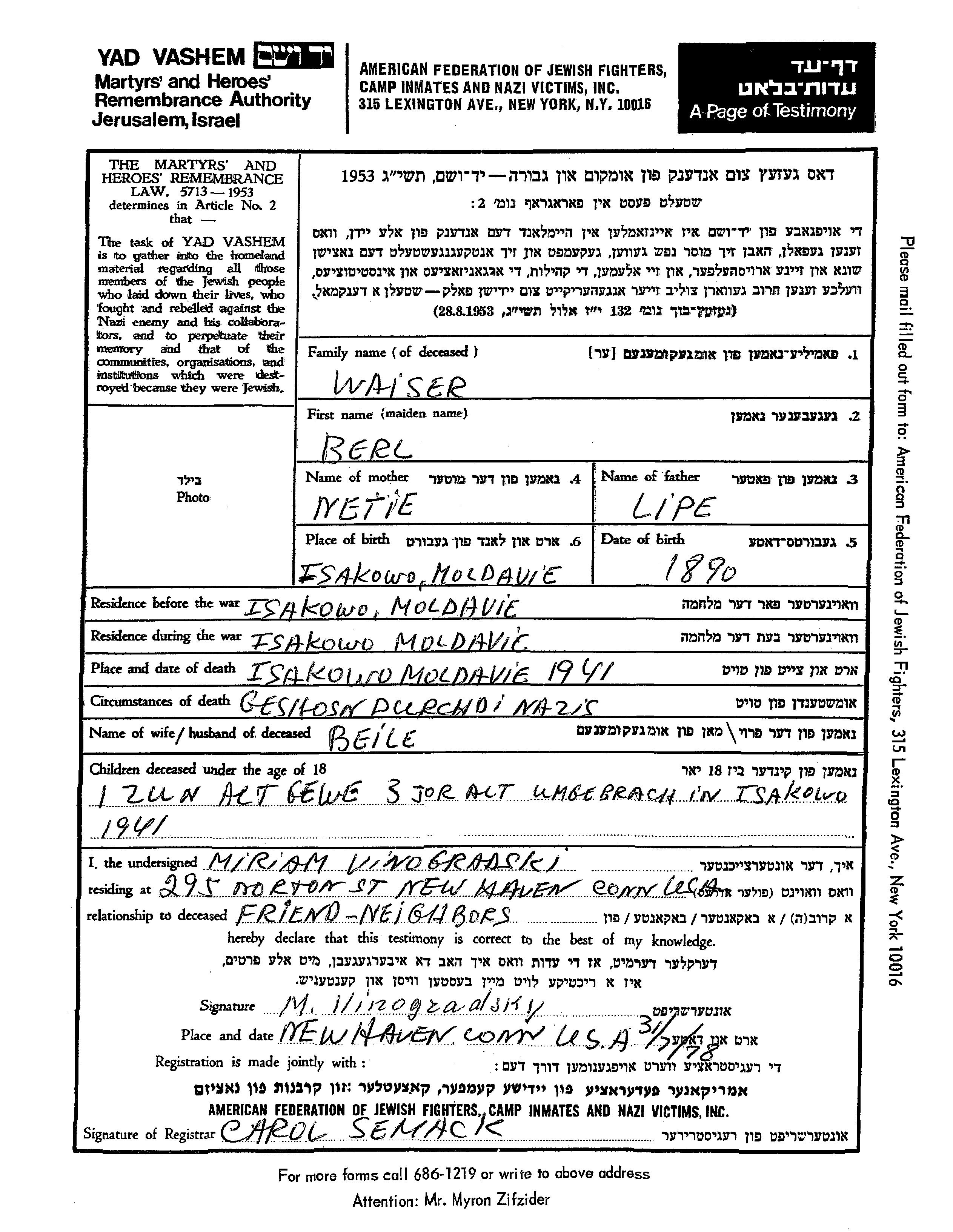 Berl Waiser est né à Isakowo, Roumanie en 1890, fils de Lipe et de Neti. Il était Mariée à Beile. Avant la seconde guerre mondiale il vivait à Isakowo, Roumanie. Au cours de la guerre, il était à Isakowo, Roumanie.