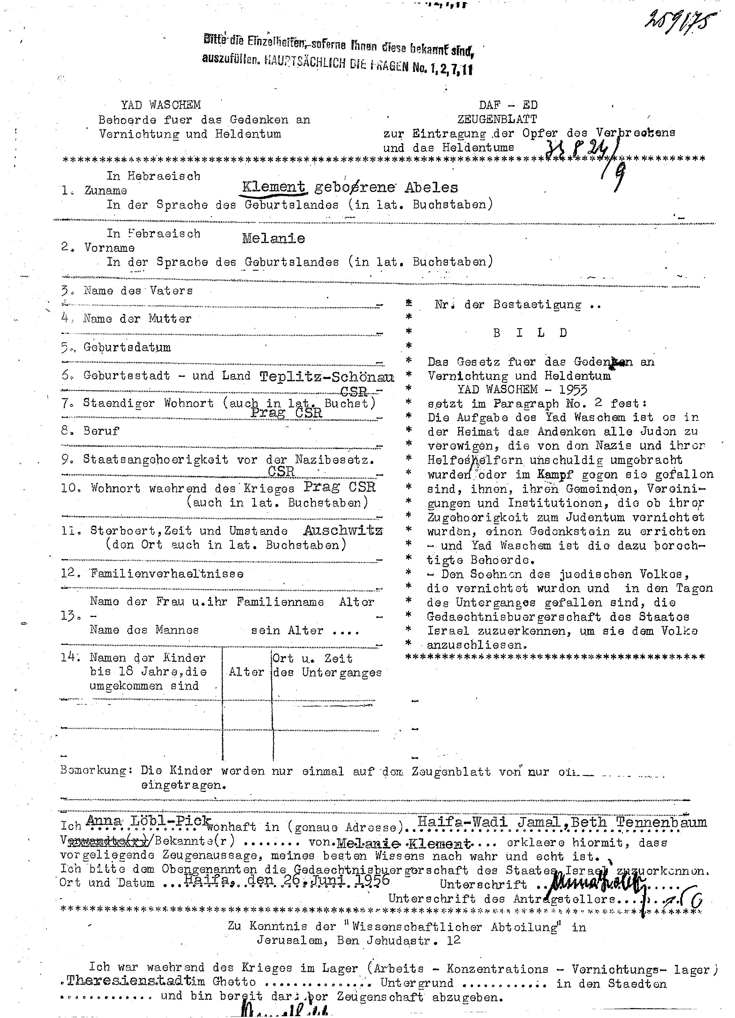 Klement Melania Prague, Tchécoslovaquie Feuille de témoignage