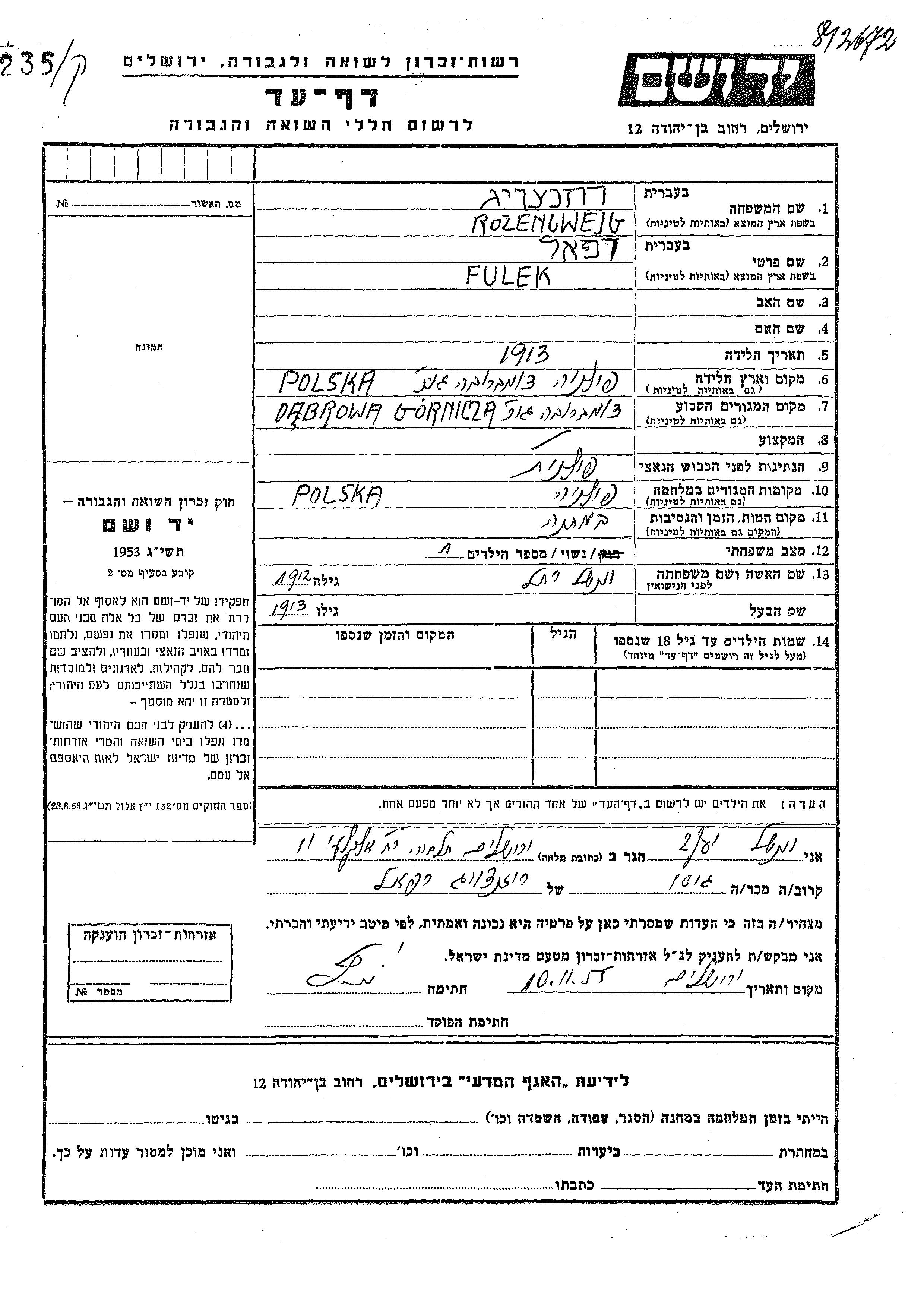 Rozencwejg Fulek 1913 Dąbrowa, Pologne Feuille de témoignage