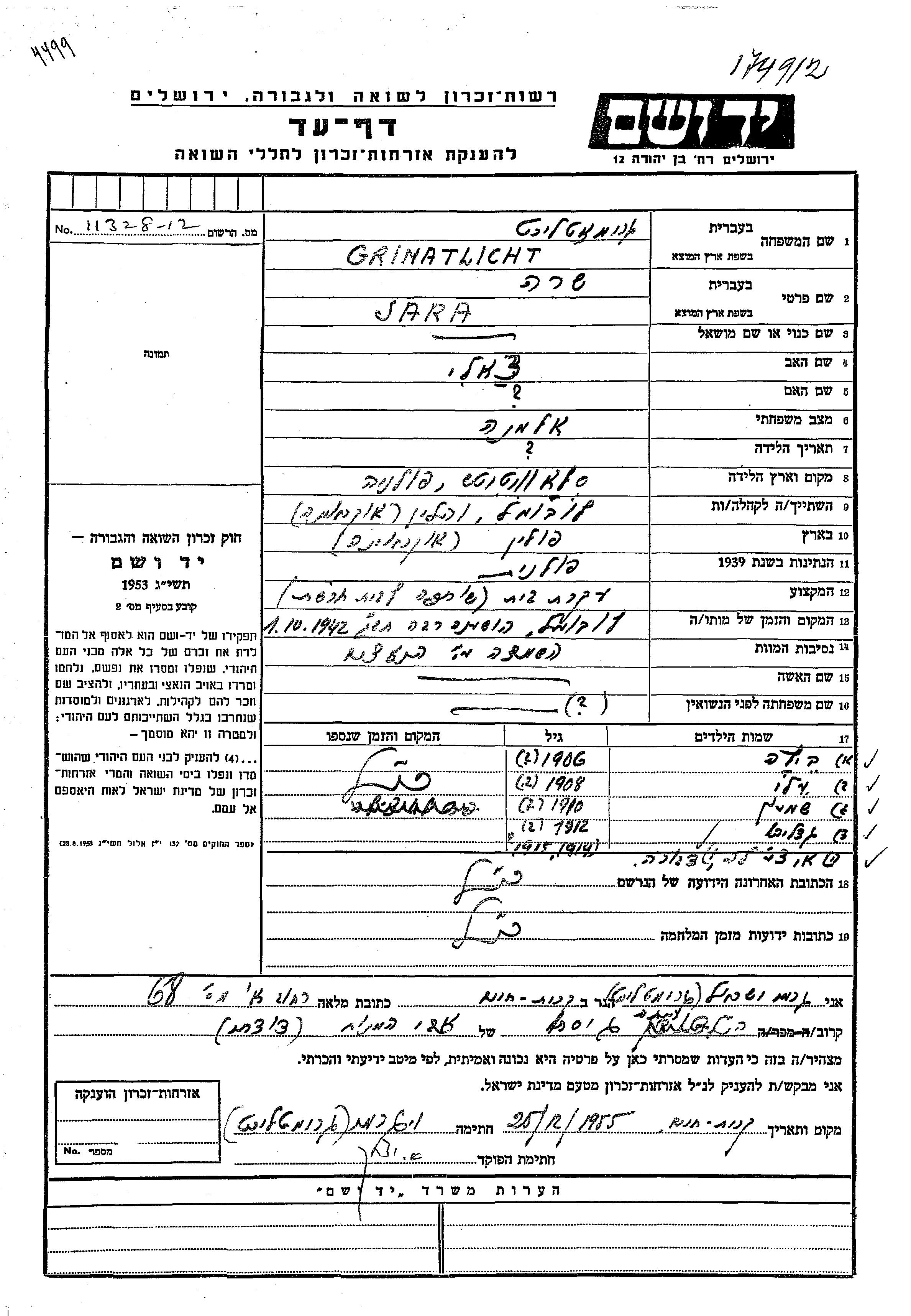 Sara Grimatlicht est née à Slawatycze, Pologne, fille de Betzalel. Elle était Femme au foyer et veuve. Avant la seconde guerre mondiale elle vivait à Pologne. Pendant la guerre, elle était à Pologne.