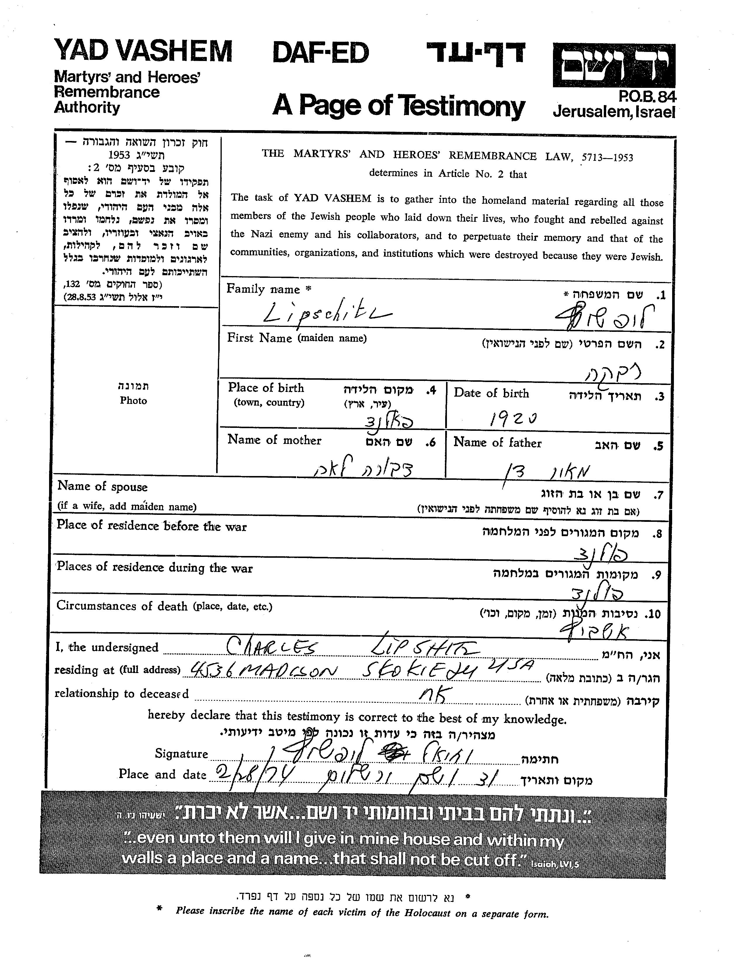 Lipschitz Rivka 1920 Pologne Feuille de témoignage