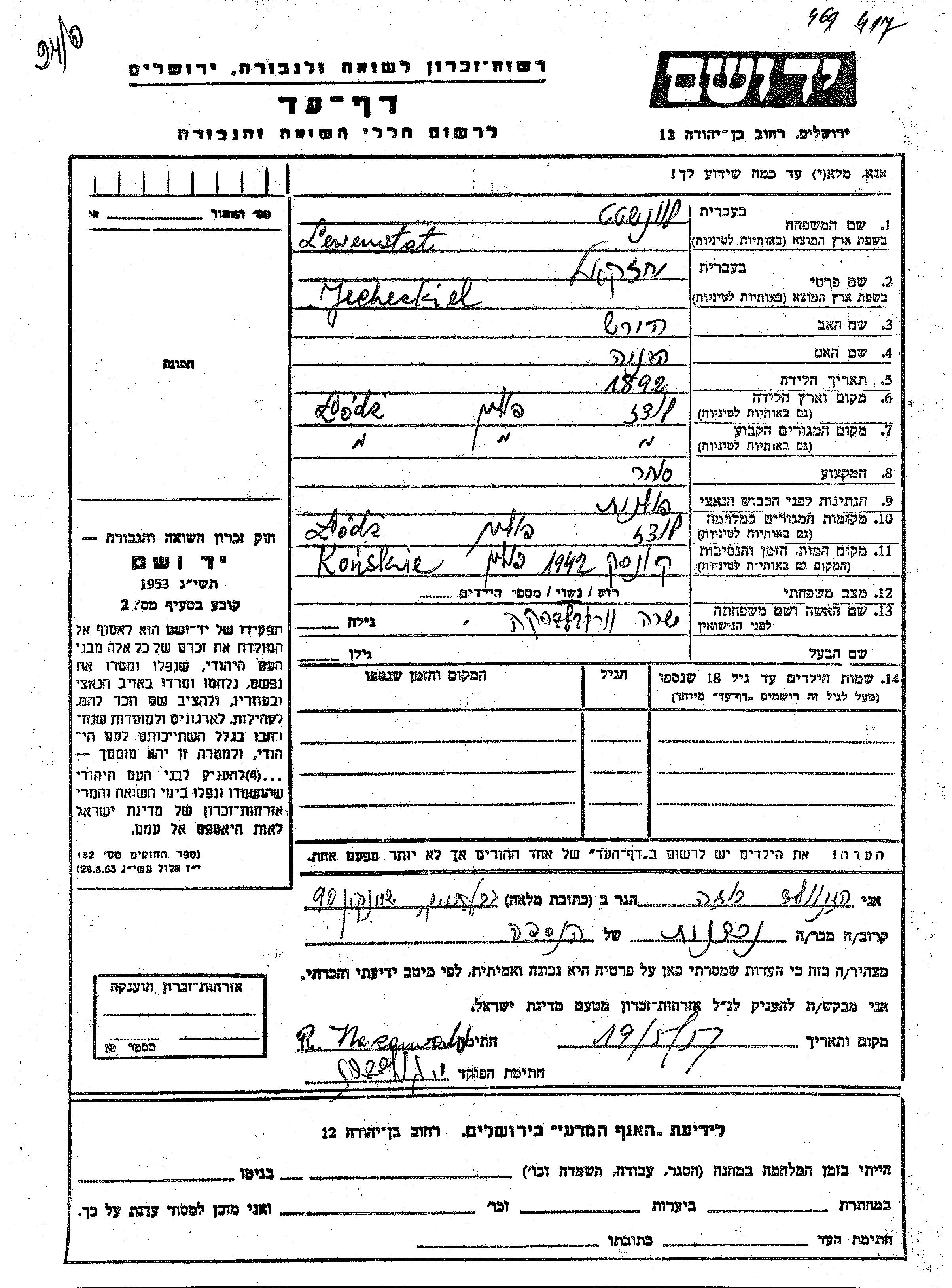 Lewenstat Jecheskiel 1892 Lodz, Pologne Feuille de témoignage