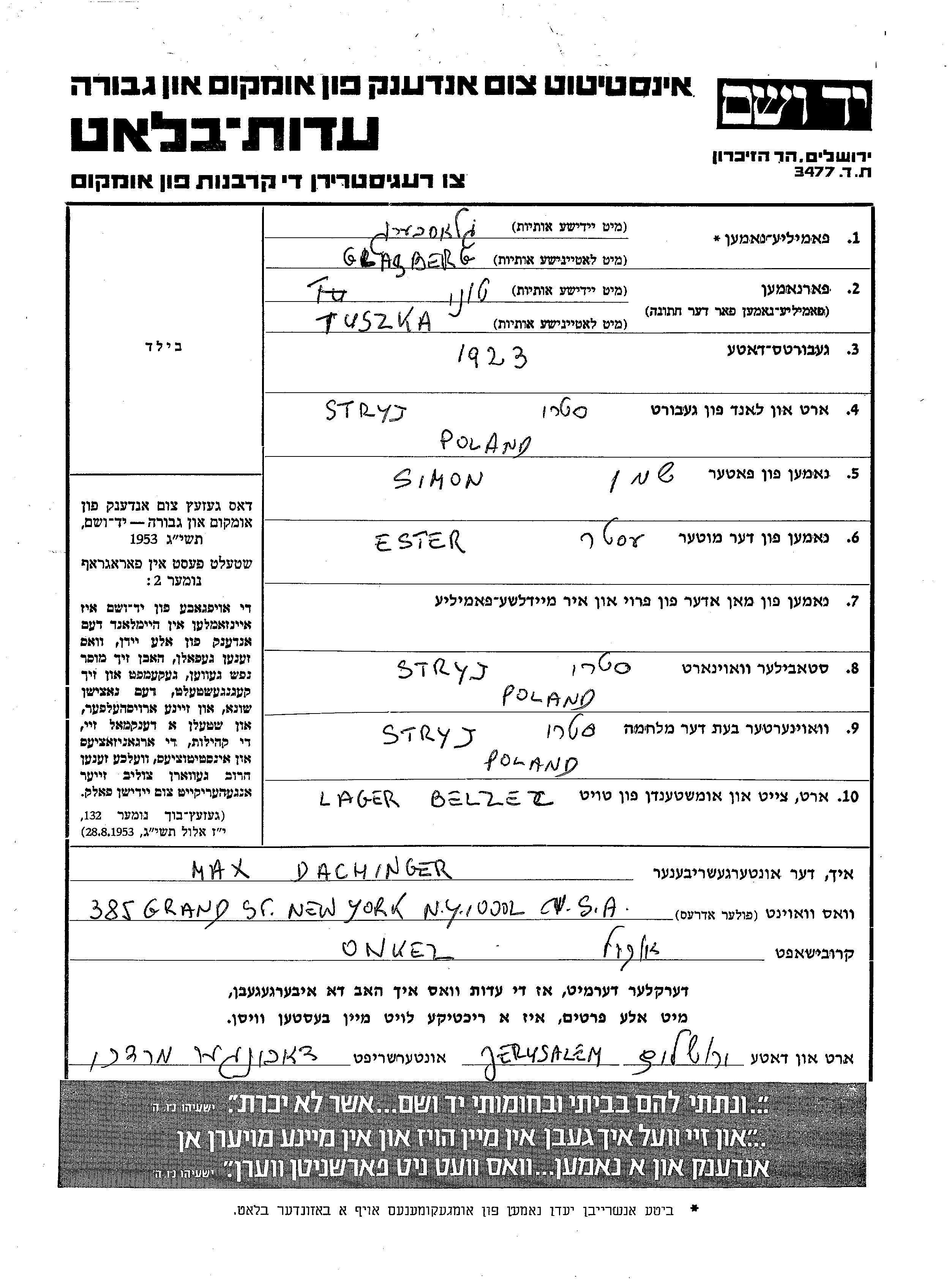 Glasberg Tuszka Toni 1923 Stryj, Pologne Feuille de témoignage