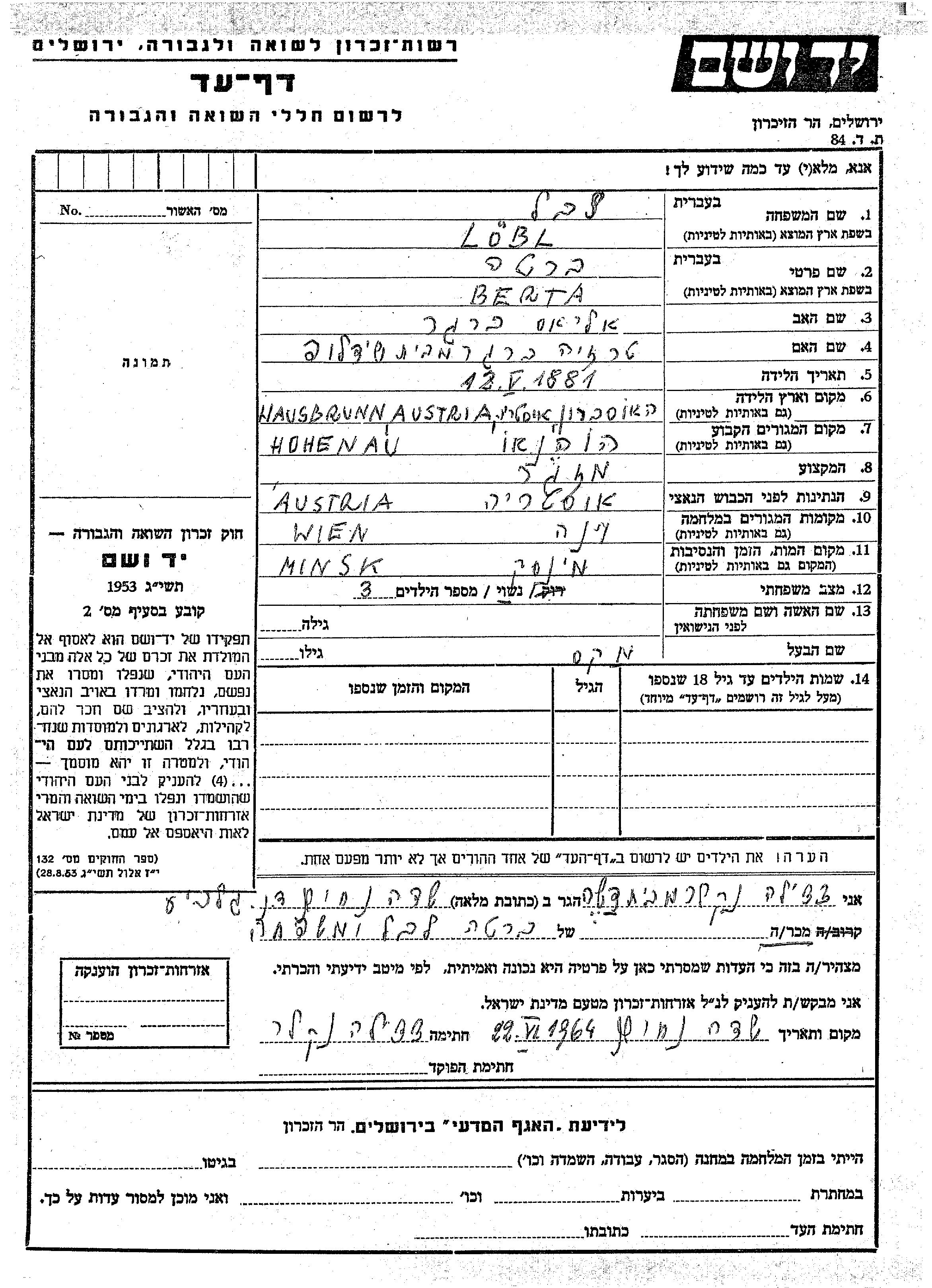 Berta Lobl née Berger est née à Hausbrunn, Tchécoslovaquie en 1881, fille de Eliahu et de Tereza. Elle était Ouvrier metallurgique et Mariée à Max. Avant la seconde guerre mondiale elle vivait à Hohenau, Autriche. Pendant la guerre, elle était à Wien, Autriche.