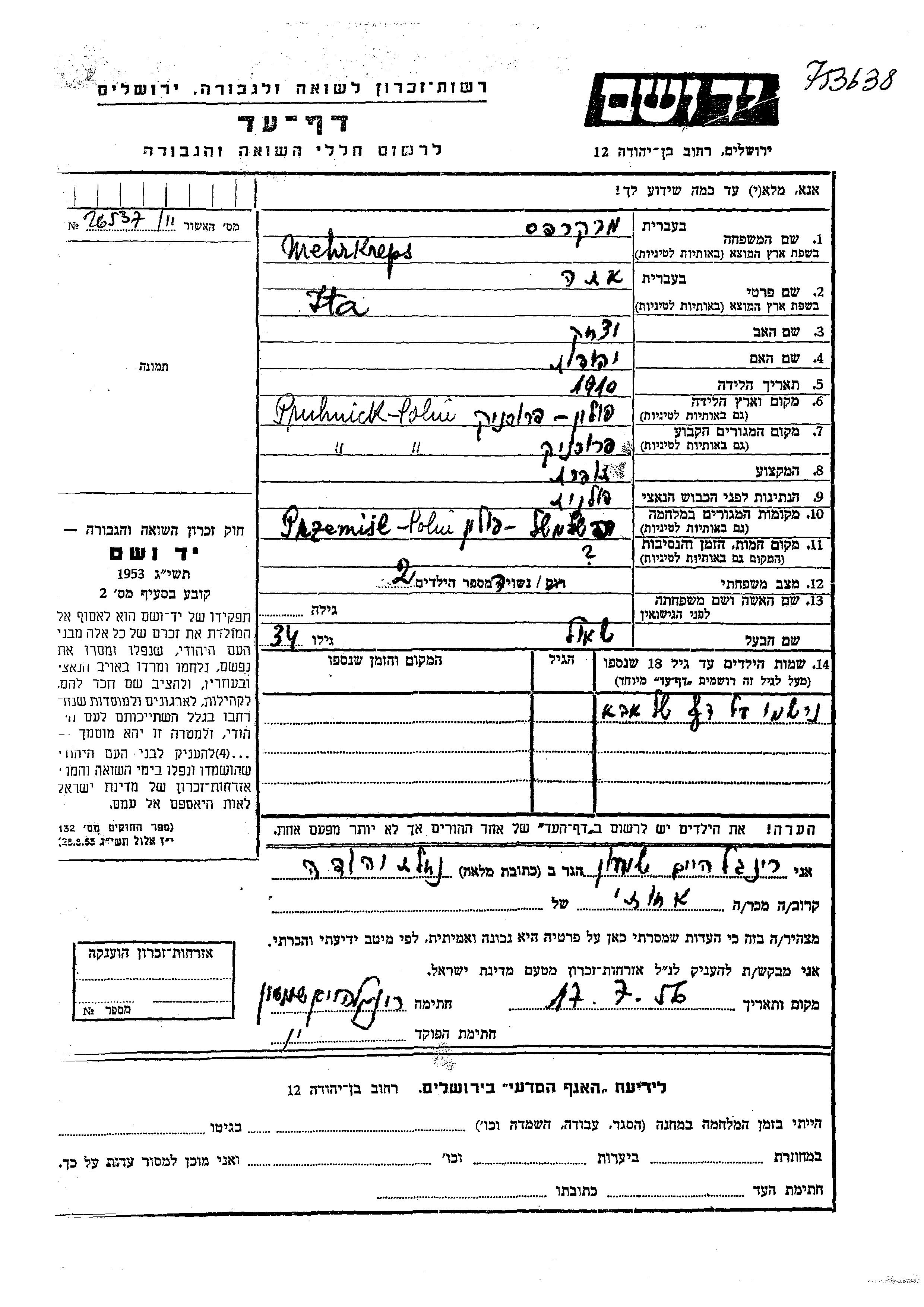 Ita Ester Mehrkreps est née à Pruchnik Miasto, Pologne en 1910, fille de Yitzkhak et de Yehudit. Elle était Couturière et Mariée à Shaul. Avant la seconde guerre mondiale elle vivait à Pruchnik Miasto, Pologne. Pendant la guerre, elle était à Przemis, Pologne.