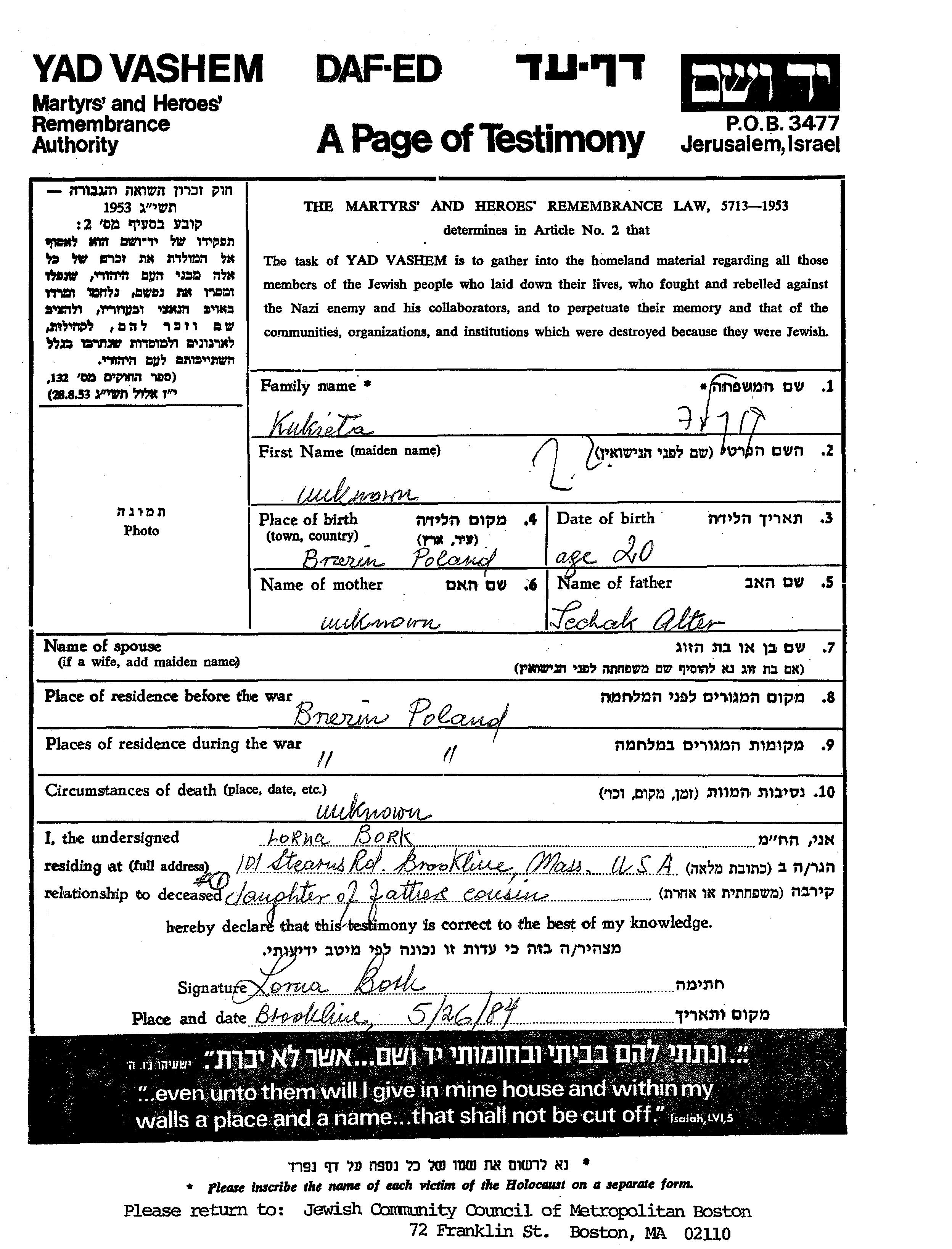 prénom inconnu Kukiela est née à Brzezin, Pologne, fille de Icchak Alter. Avant la seconde guerre mondiale elle vivait à Brzezin, Pologne. Pendant la guerre, elle était à Brzezin, Pologne.