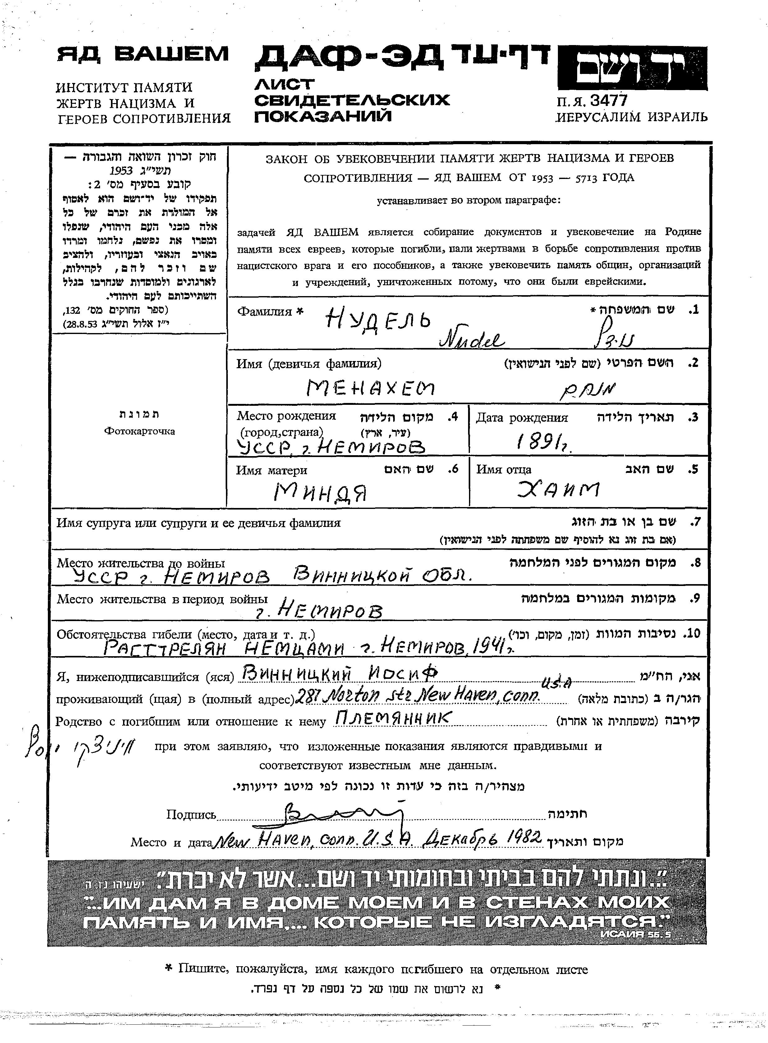 Nudel Menakhem 1891 Nemirov, Ukraine (URSS) Feuille de témoignage