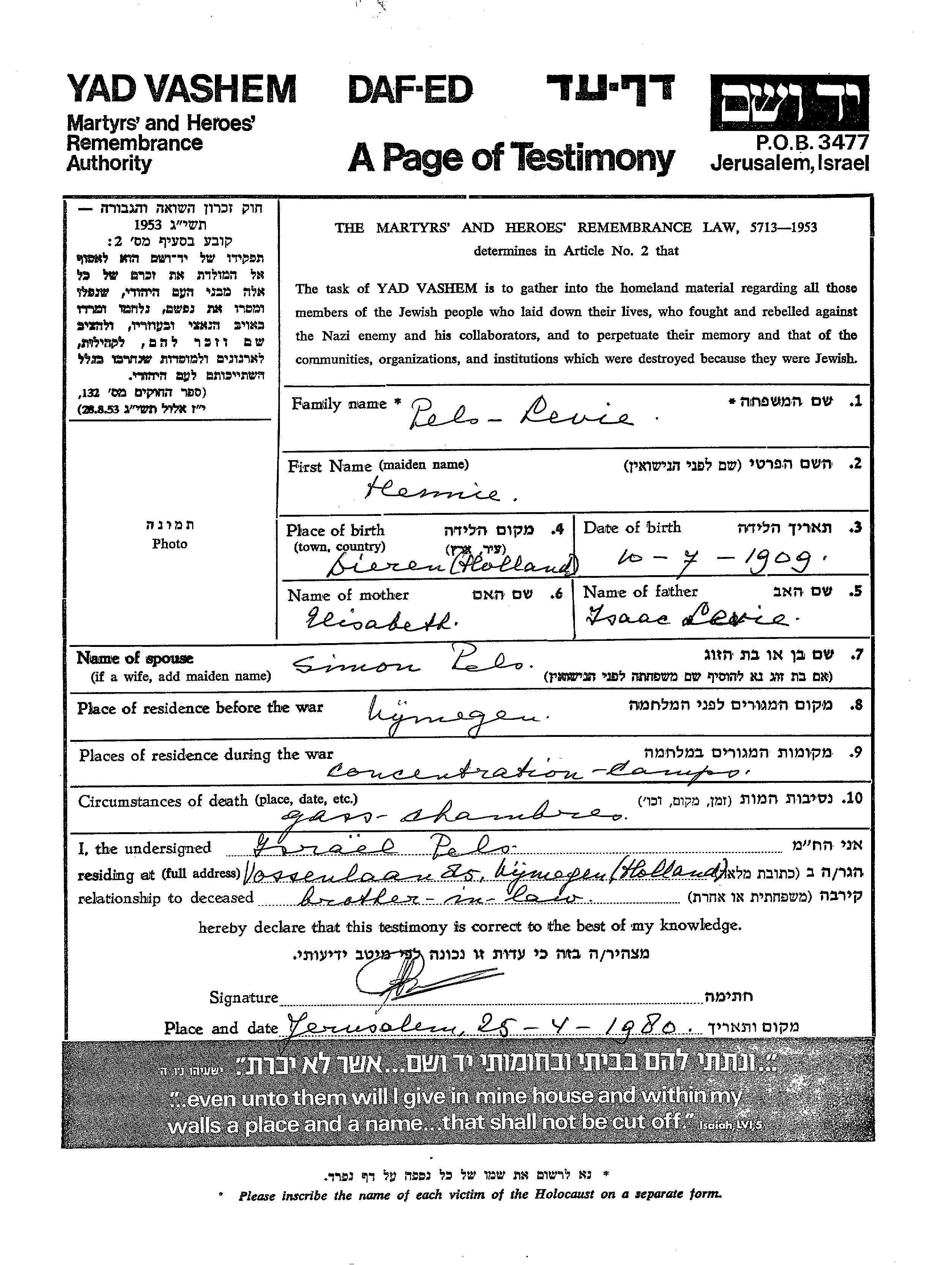 Hennie Pels née Levie est née à Dieren, Pays-Bas en 1909, fille de Isaac et de Elisabeth. Avant la seconde guerre mondiale elle vivait à Nymegen, Pays-Bas.