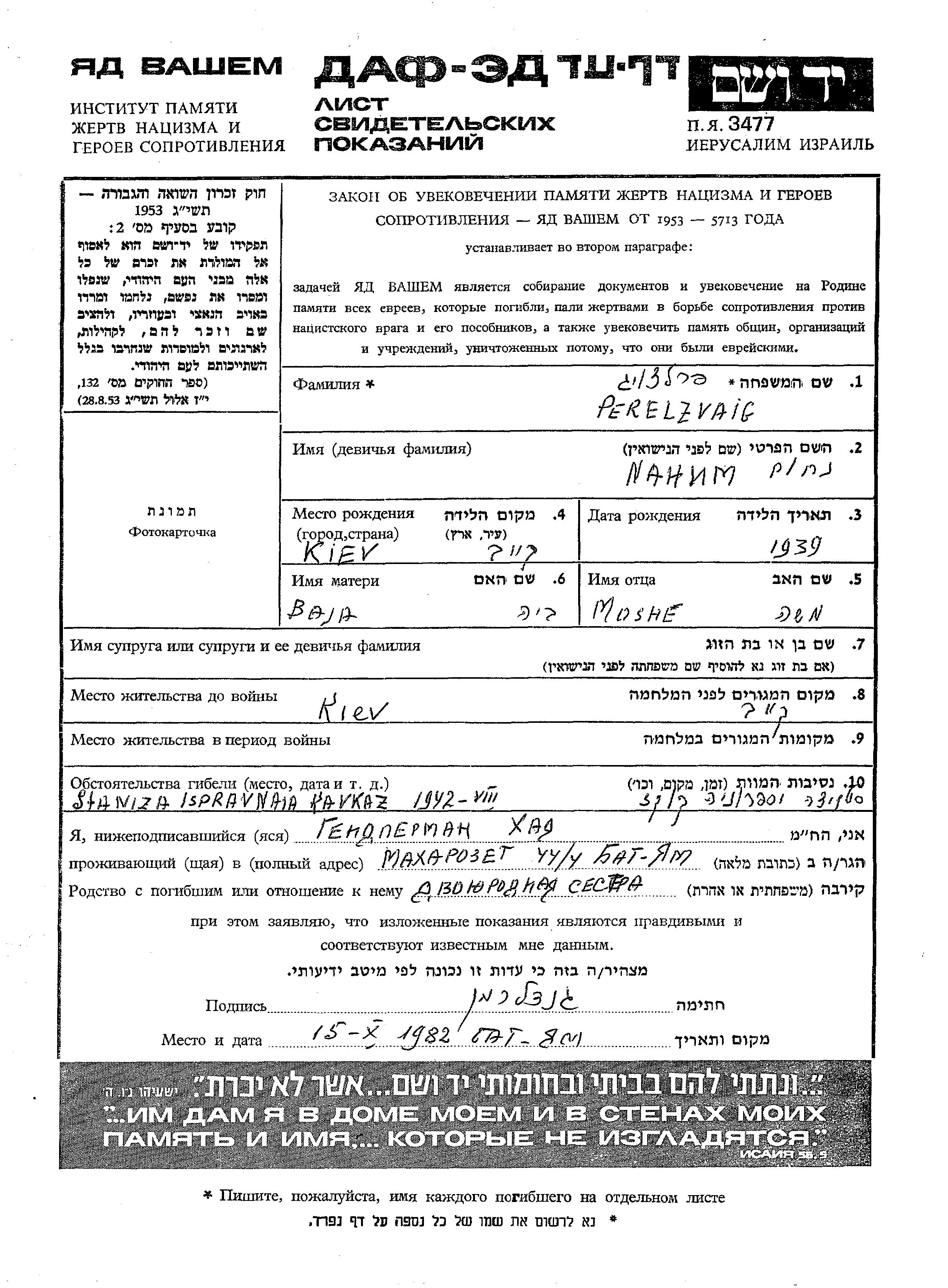 Perelzvaig Nahum 1939 Kiev, Ukraine (URSS) Feuille de témoignage