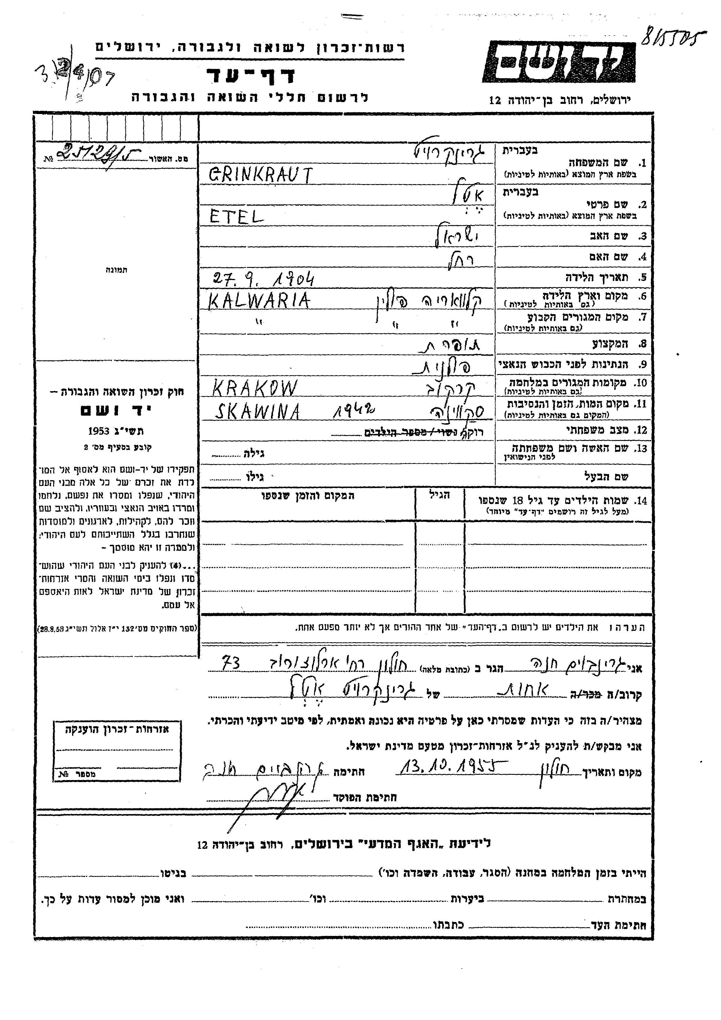 Etel Grinkraut est née à Kalwaria, Pologne en 1904, fille de Yisrael et de Rakhel. Elle était Couturière et Célibataire. Avant la seconde guerre mondiale elle vivait à Kalwaria, Pologne. Pendant la guerre, elle était à Krakow, Pologne.