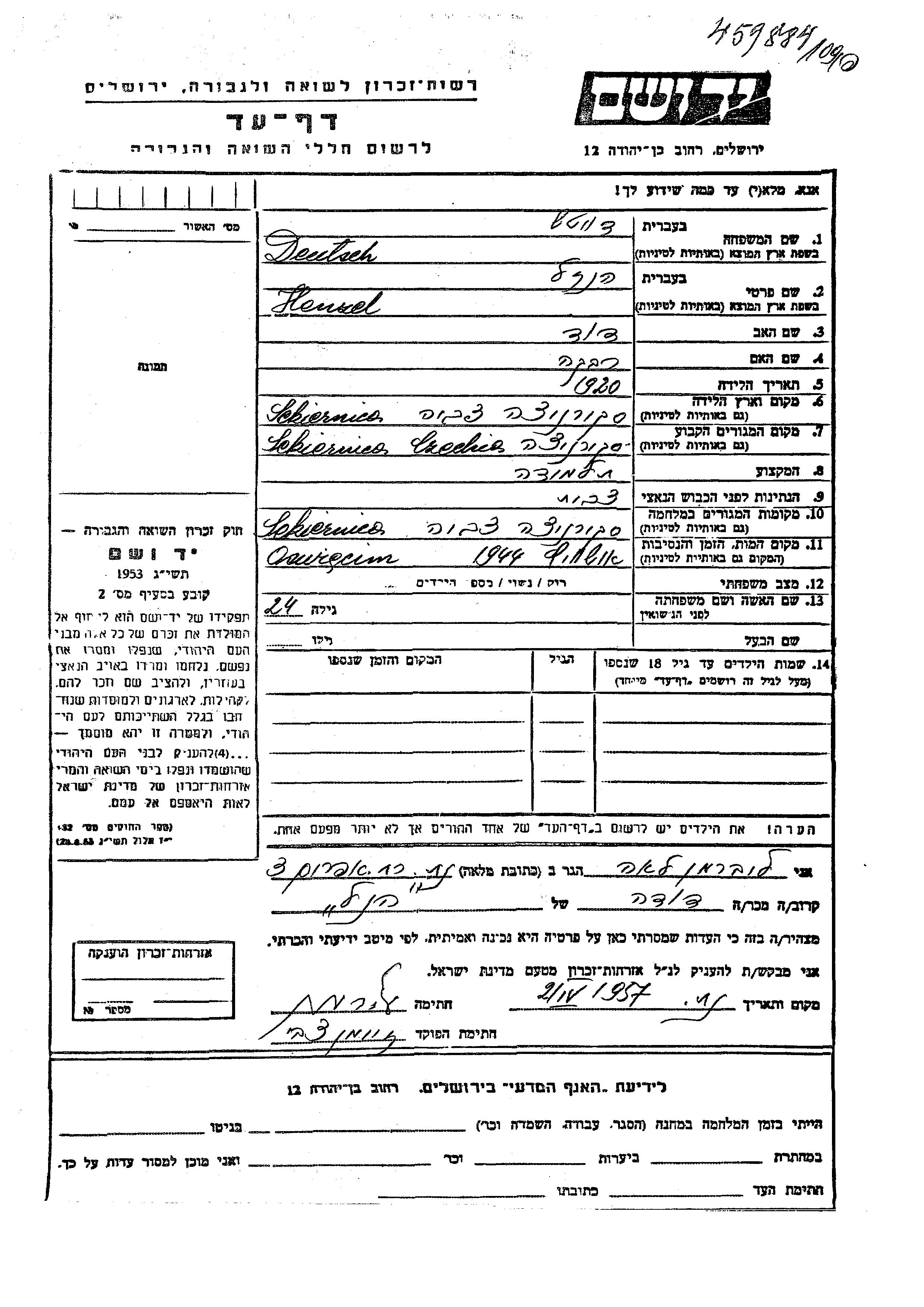 Deutsch Yohan 1920 Sekiernica, Tchécoslovaquie Feuille de témoignage